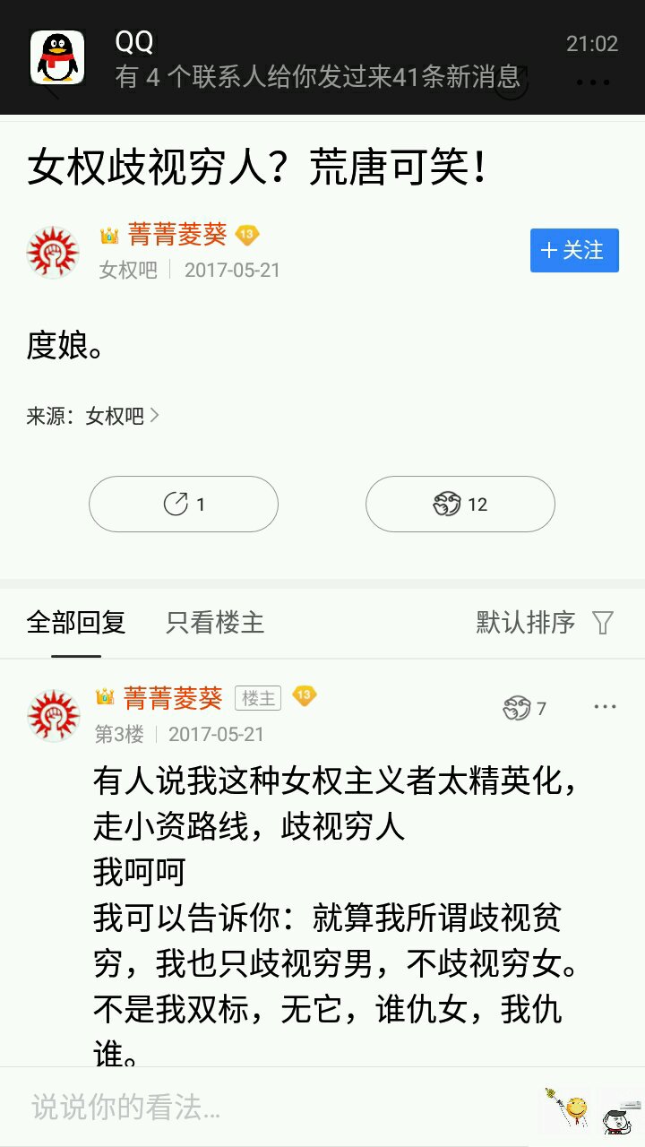贴吧意见反馈吧 【Android反馈】申请禁封女权吧及女权吧吧!tid:56260826822018/03/31 09:13:2135016097 5 0 0楼主:我们的豌豆 新海天🍺最后回复:sj20080728 刺王杀架⚡2019/02/22 22:07:1443楼pid:1189697750712018/04/02 21:03:52我们的豌豆新海天🍺 楼主 6级