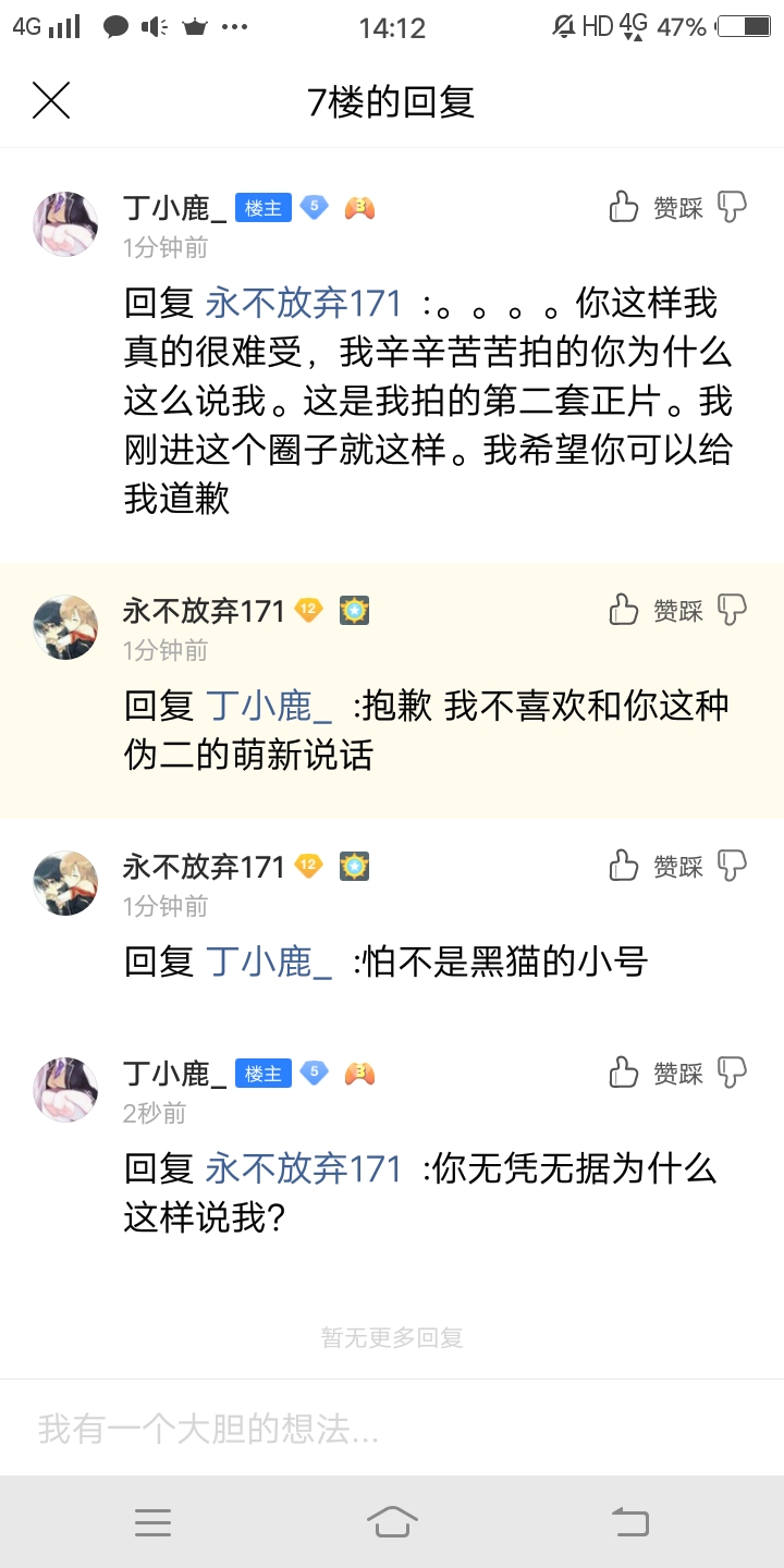 起始页cosplay吧 【挂人】我来说一下这个空口鉴盗图的永不放弃171tid:61482802162019/05/31 10:57:343934178 8 93 66楼主兼最后回复:丁小鹿_2019/06/22 22:27:212楼2条pid:1258812681752019/05/31 10:59:07丁小鹿_ 楼主 7级 这个171属实毒瘤哈。之前我在贴吧发雏莓正片,他上来直接要我离开圈子。说我daotu,说我是黑猫小号,全部都是毫无凭证的。丁小鹿_ 楼主 层主 7级 怎么乱入了一张我跟我爸乞讨零花钱的截图?哈哈!我不想活啦