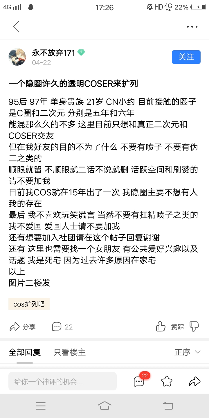 起始页cosplay吧 【挂人】我来说一下这个空口鉴盗图的永不放弃171tid:61482802162019/05/31 10:57:343934178 8 93 66楼主兼最后回复:丁小鹿_2019/06/22 22:27:2112楼pid:1258814375562019/05/31 11:10:03丁小鹿_ 楼主 7级 镇楼就是171照片哈。到处自称是coser,要找个会撒娇的女朋友,还说自己不爱国 爱国的人不要找他,我寻思你那个妆容造型随便拍一张,你就是出了一次cos了?还好意思空口无凭说别人是伪coser?