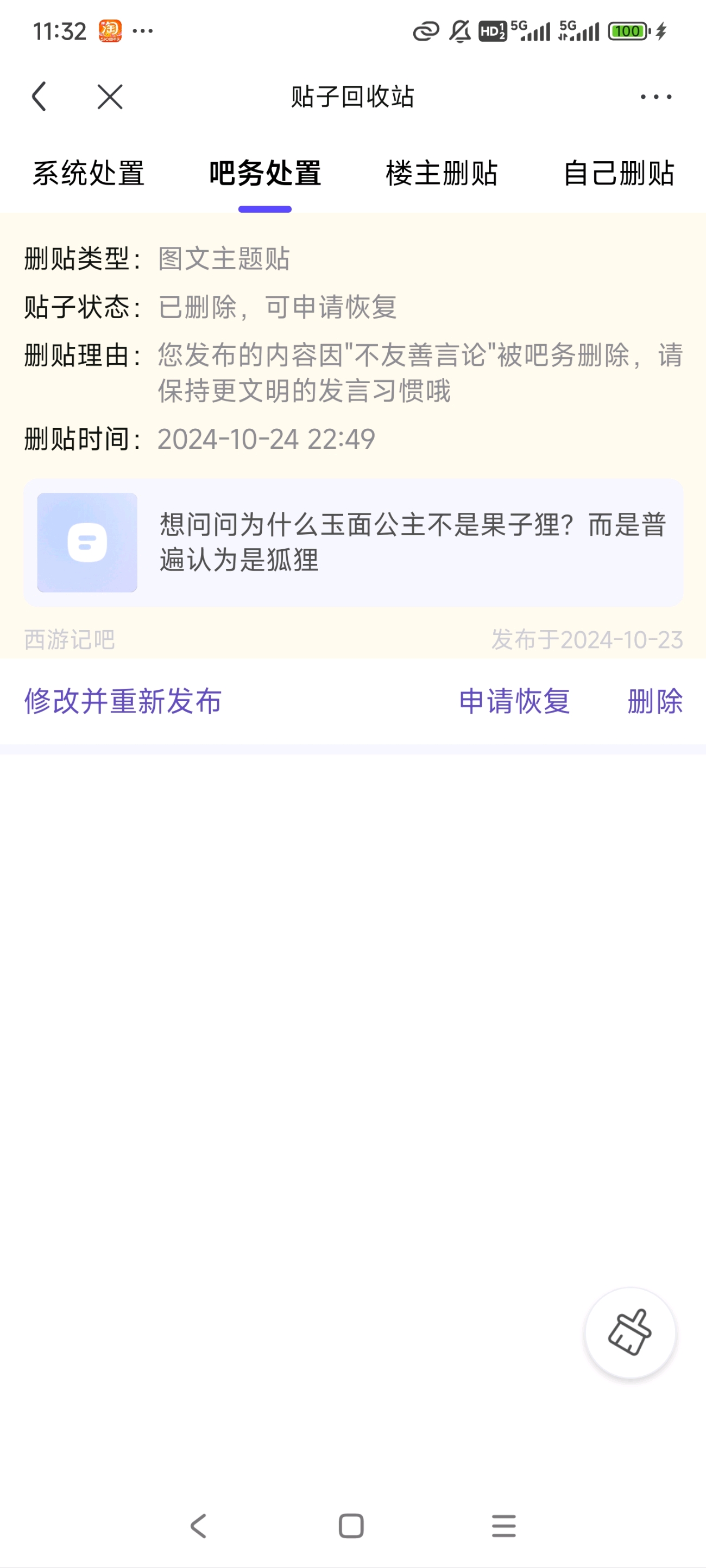 贴吧意见反馈吧 投诉西游记小吧【银瞳锦发的燕顺】tid:92322048882024/10/22 20:10:00703686 1 18 0楼主兼最后回复:虚蟜2025/12/16 22:59:3911楼25条pid:1511194896542024/10/24 23:51:00当然太多太多1级 的确,我的也不知道被谁删了。我还研究了一下吧规,1.我没骂人,2.有一个人回复我的问题我也是正经提出反驳的原因,3.吧里天天在那里比武和吐垃圾也没人管,建议改成西游记论战吧或者西游记垃圾桶吧。虚蟜 楼主 1级 回复 当然太多太多 :这帮吧务都魔怔成什么样了。。。