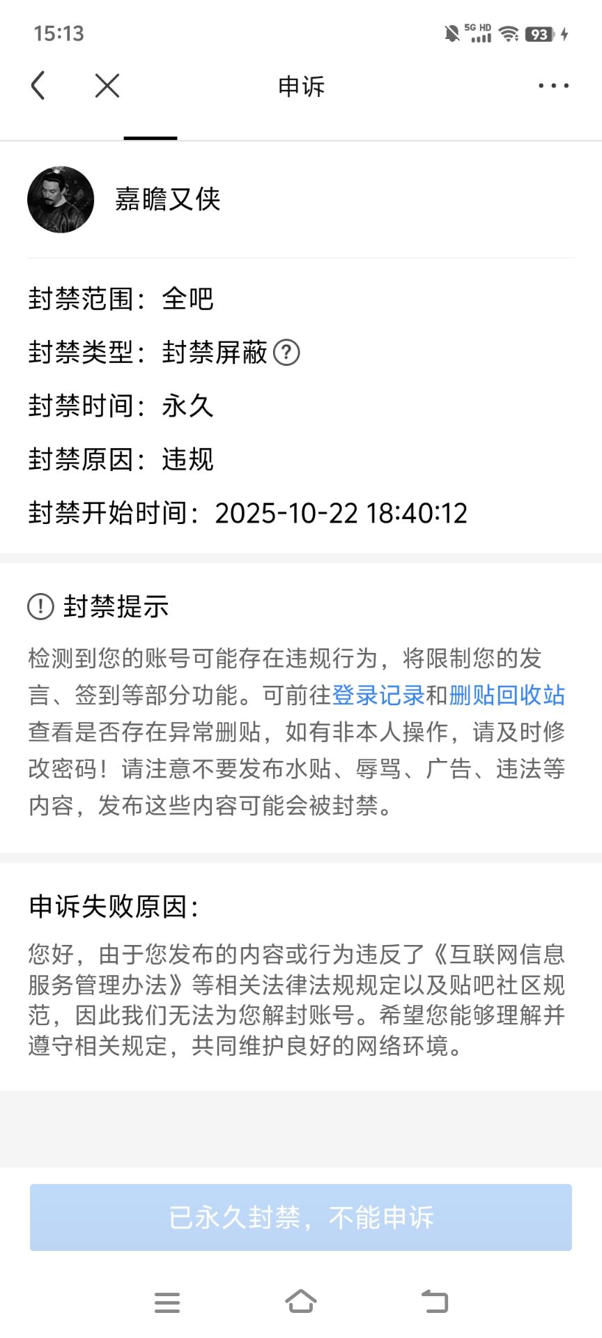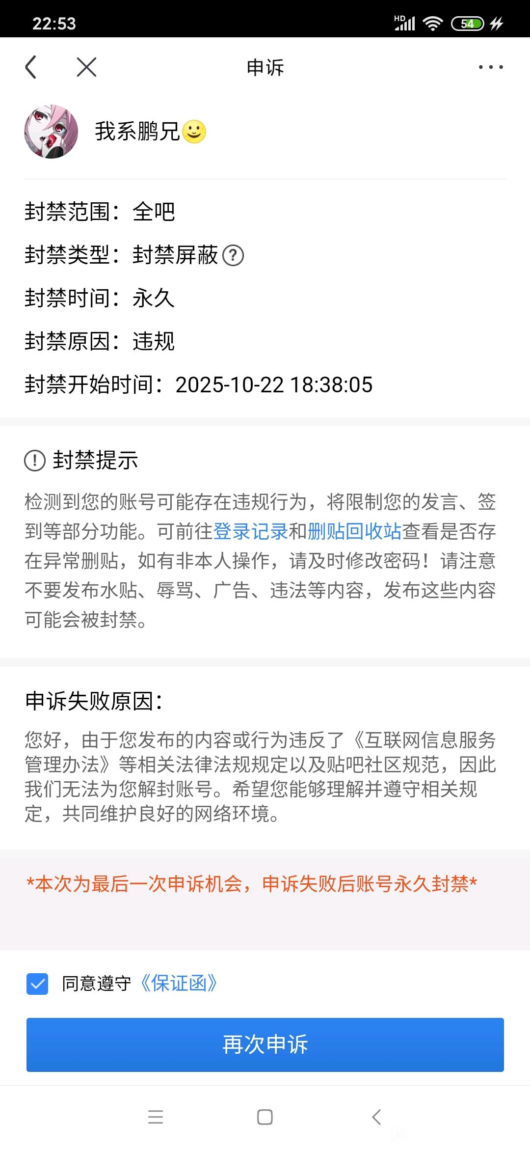 贴吧意见反馈吧 申请解封!!谢谢tid:101538275632025/10/24 15:18:37161151 1 0楼主:一美太太 周吉婕最后回复:一美太太爱新觉罗颐心º2025/12/06 00:29:571楼pid:1527744549912025/10/24 15:18:37一美太太周吉婕 楼主 1级 看了下都是10.22日晚上6点左右被封禁,是百度的问题吧,这么大批量的。三次申诉失败,麻烦解封啊@贴吧阿Sir2楼2条pid:1527744974372025/10/24 15:30:30挥洒寂寞闯天涯轮回无尽1级 上互联网信息服务平台投诉吧一美太太 周吉婕 楼主 1级 现在这个还行吗?泰瑟兰顿1级 管用吗3楼1条pid:1527746680162025/10/24 16:19:58我系鹏兄13145级 我就是最后一次才不敢申诉 百度这波无敌了一美太太 周吉婕 楼主 1级 其实我也,我第二次不行我就猜到了,结果好像17分钟就给我驳回了,无语,贴吧体验太差了4楼1条pid:1527746728192025/10/24 16:21:28北京独立77豫独先锋7级 帮顶一美太太 周吉婕 楼主 1级 谢谢5楼pid:1527750490142025/10/24 18:18:07与你同行8884447级 没用,别想了 解不开6楼2条pid:1527884093622025/10/28 06:09:04崖芬互相帮助饮鸠不止渴1级 能解宝,因为我之前也是,不懂问我一美太太 周吉婕 楼主 1级 现在最近的能解了吗? 求教SZ美丽的风景1级 回复 周吉婕 :这是骗子别信7楼pid:1529308359982025/12/03 19:27:38鸭鳄457级 搜狗插件死缠烂打无限申请,但一周只一次就可以了,别太多,太多反而会影响解封时间8楼pid:1529343430932025/12/04 16:38:06一美太太周吉婕 楼主 1级 现在有人能解封了嘛?9楼pid:1529344645762025/12/04 17:11:00小尼姑还俗记6级 千万不能放弃10楼2条pid:1529375281922025/12/05 11:42:27一美太太周吉婕 楼主 1级 统一回复一下,我那个号自己解封了柏雪无敌 小熊🌺19744级 什么情况,你当初自主申诉被驳回,和你说永封不能申诉。然后又过段时间,它自己解封了吗一美太太 周吉婕 楼主 层主 1级 回复 三少爷的眼泪 :对,是的。三次永封,然后我一直没管那个号了,就我昨天还在问嘛,然后我切到我一个吧找资料,看到那个号发的贴出来了,我还确认了一眼11楼1条pid:1529379875912025/12/05 13:51:52zjh19116784521南风っ晓月8级 没解一美太太 周吉婕 楼主 1级 那也真的是玄学了我啥都没搞,放在那,我昨天登录贴吧找资料,后面才发现那个号解了