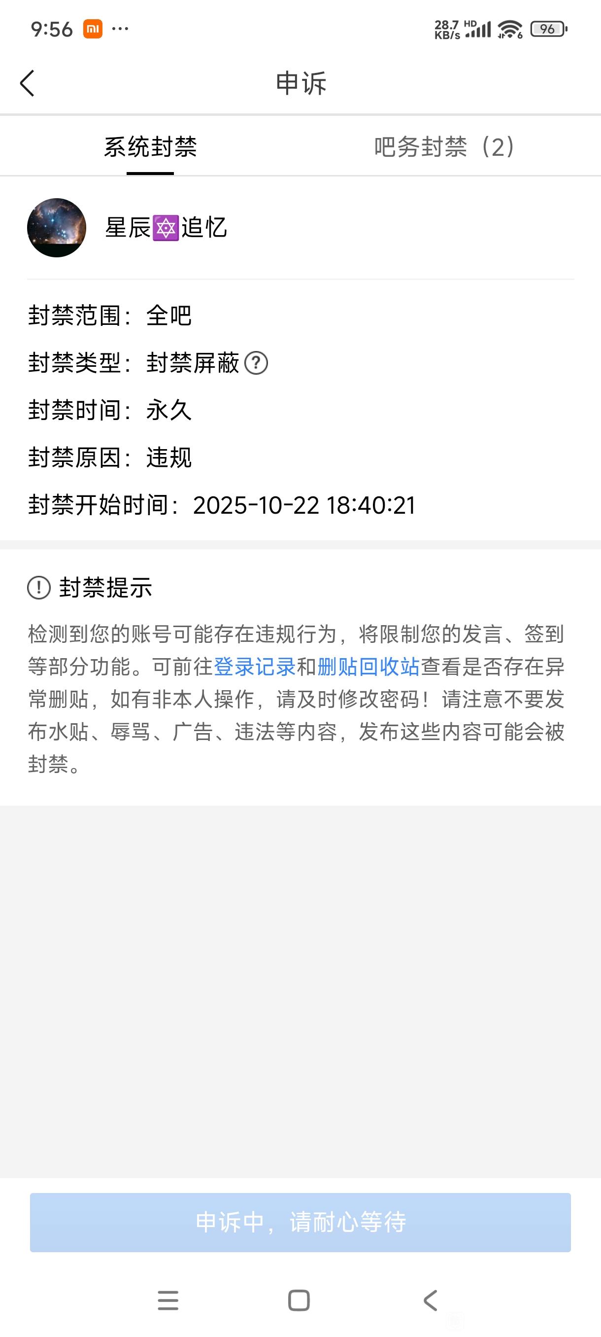 1楼pid:1527815843202025/10/26 12:15:31星辰⭐️流火 楼主 6级 10月22号晚上六点半遭遇无差别封禁,本人的11年大号也被波及,期间无任何违规记录,签到、发言活跃,是正常贴吧用户,请解封!