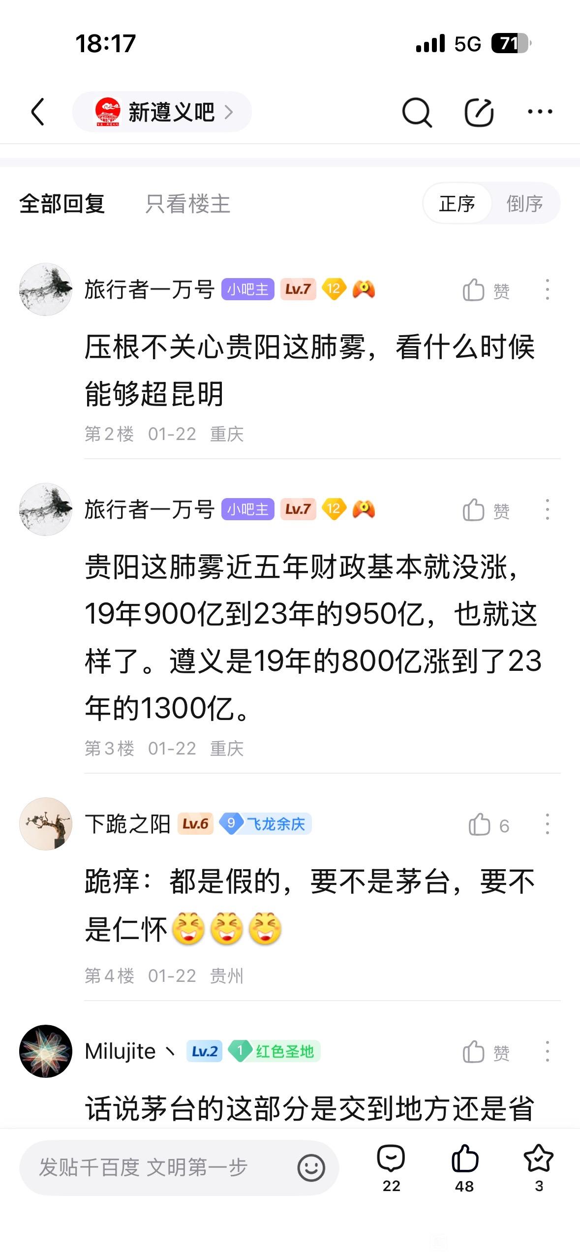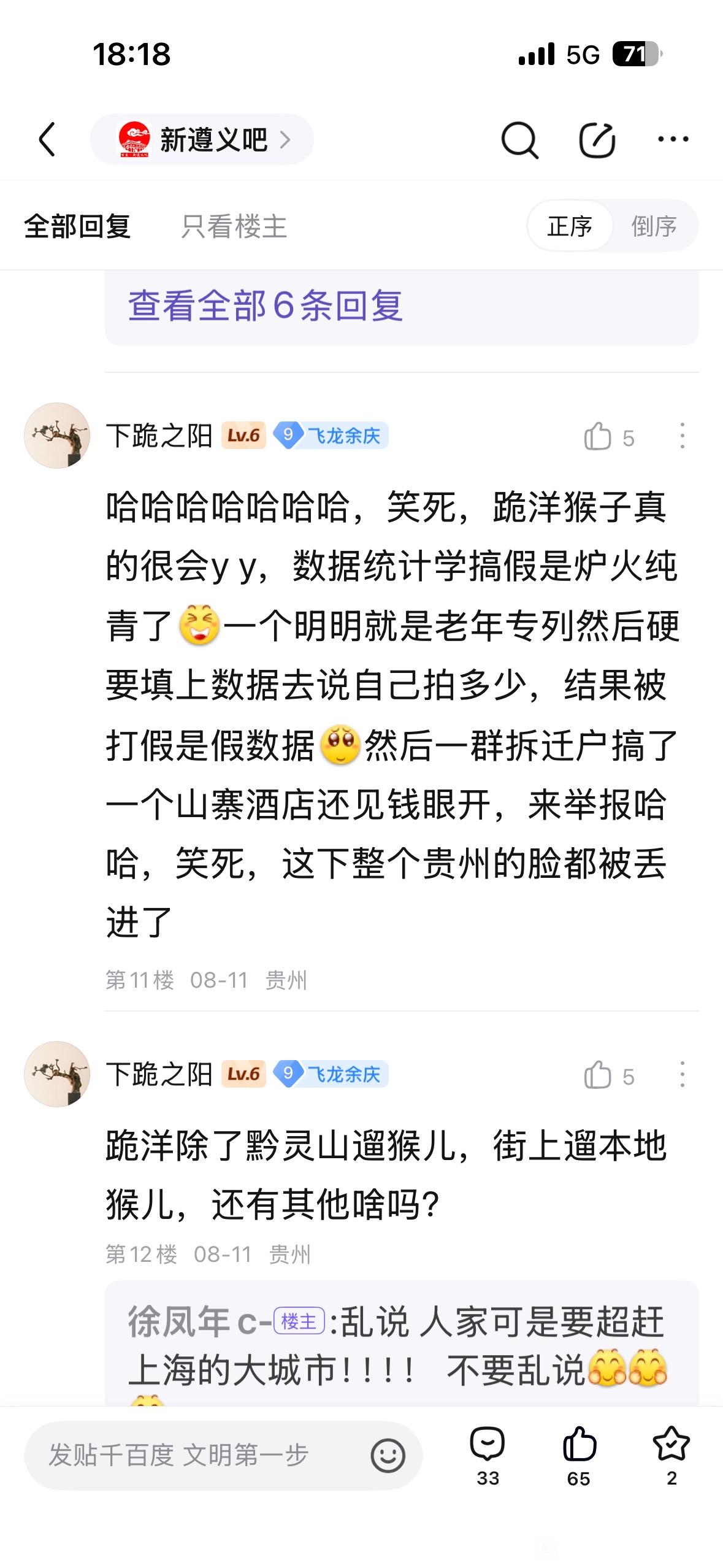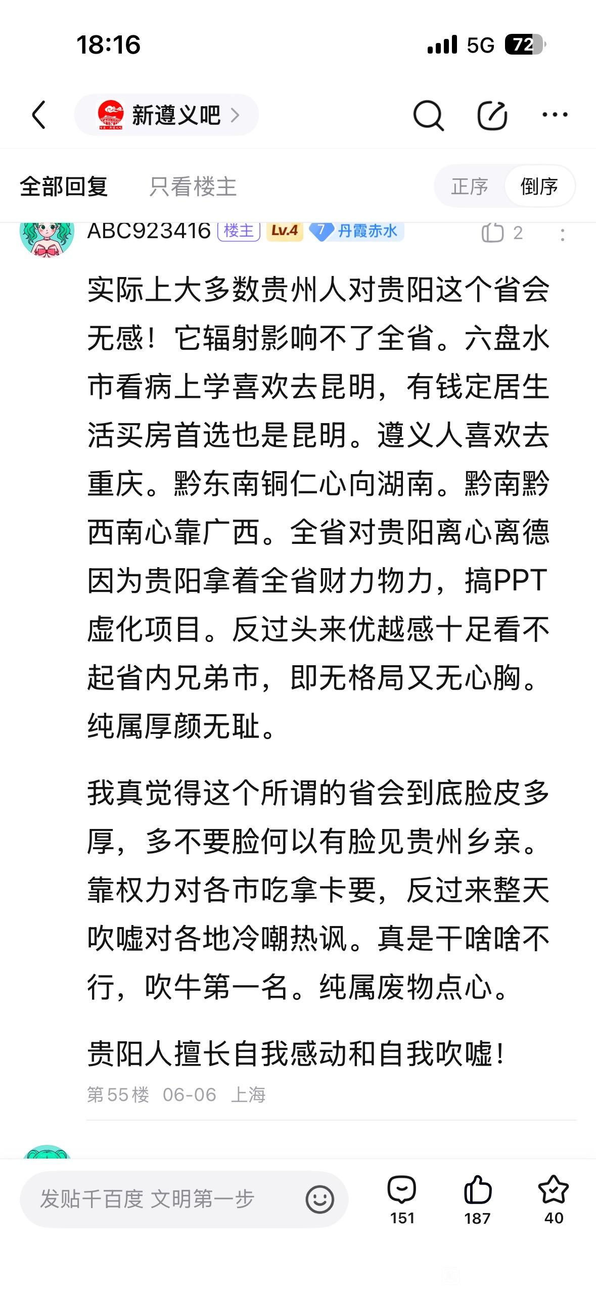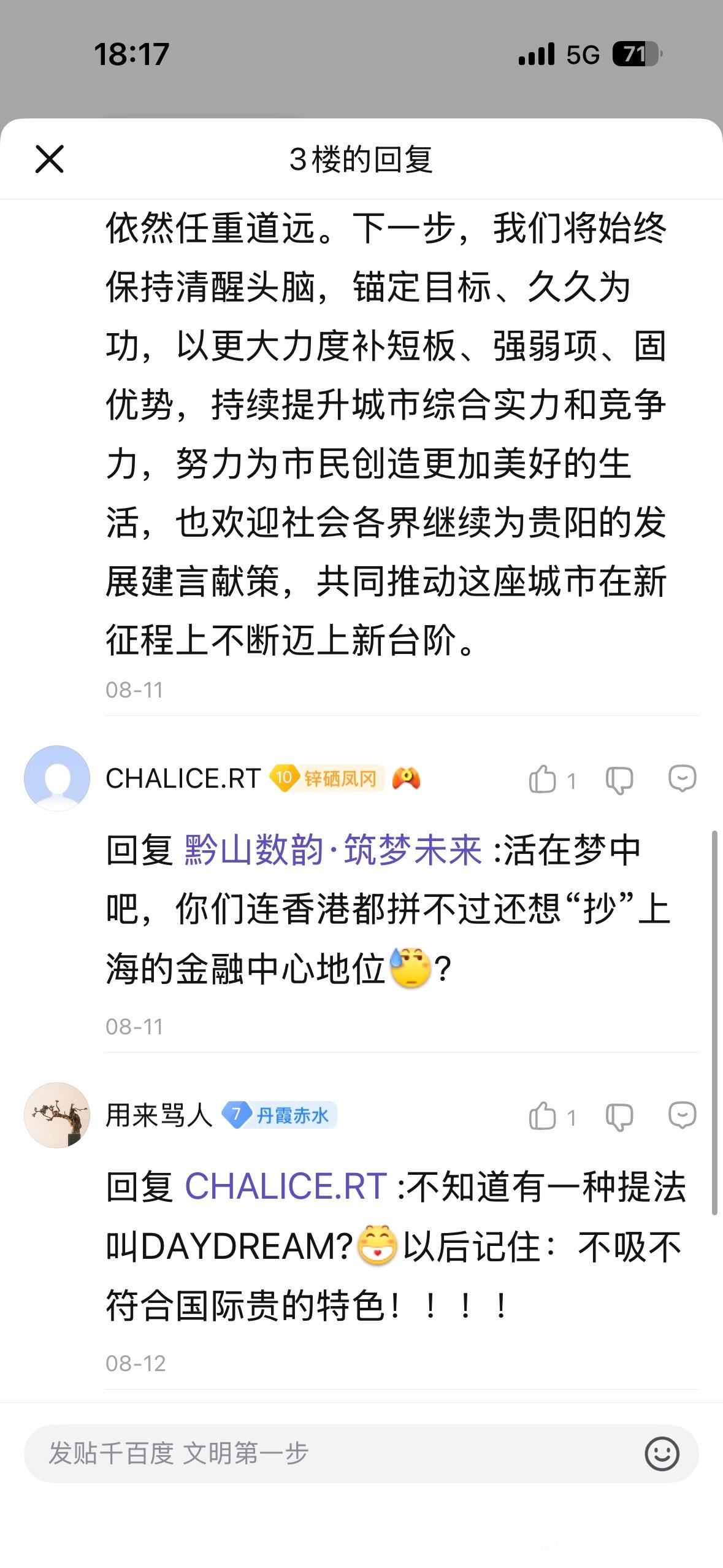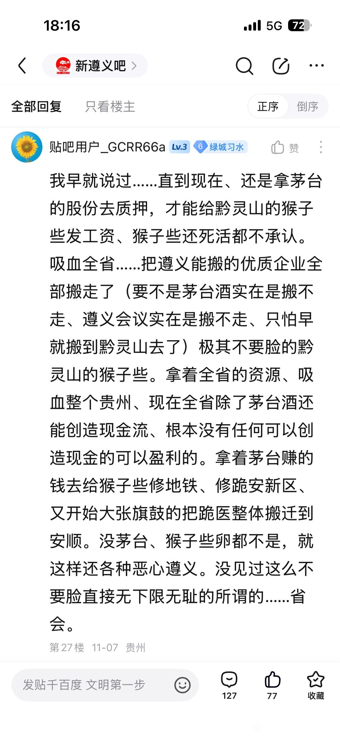 18楼pid:1528340547382025/11/08 18:42:18变化磁场有涡流强省会笃行者1级 关于“新遵义吧”大量违规内容的举报这些言论里充满了恶意的地域对立、低俗人身侮辱与片面抹黑,本身就是非理性、不文明的表达:贵州各地市本是协同发展的整体,遵义与贵阳、贵安都是贵州发展的重要组成部分,彼此互补共进而非“受制“对立”,煽动地域割裂、挑起同胞矛盾,既违背城市发展的实际逻辑,也伤害了省内的情感联结;而人身辱骂、低俗攻击更是对网络文明的践踏一一网络交流的前提是尊重,这类言论不仅失德,更涉嫌违反网络管理规范;至于对城市发展、品牌资源的恶意曲解(比如将茅台歪曲为“提款机”),则是对地方发展实际的无视,城市基建、资源调配本是循序渐进的系统工作,片面抹黑不过是情绪宣泄的偏见。网络不是法外之地,理性、尊重才是交流的基础,与其用恶意言论制造对立,不如理性看待城市发展的互补与共进。