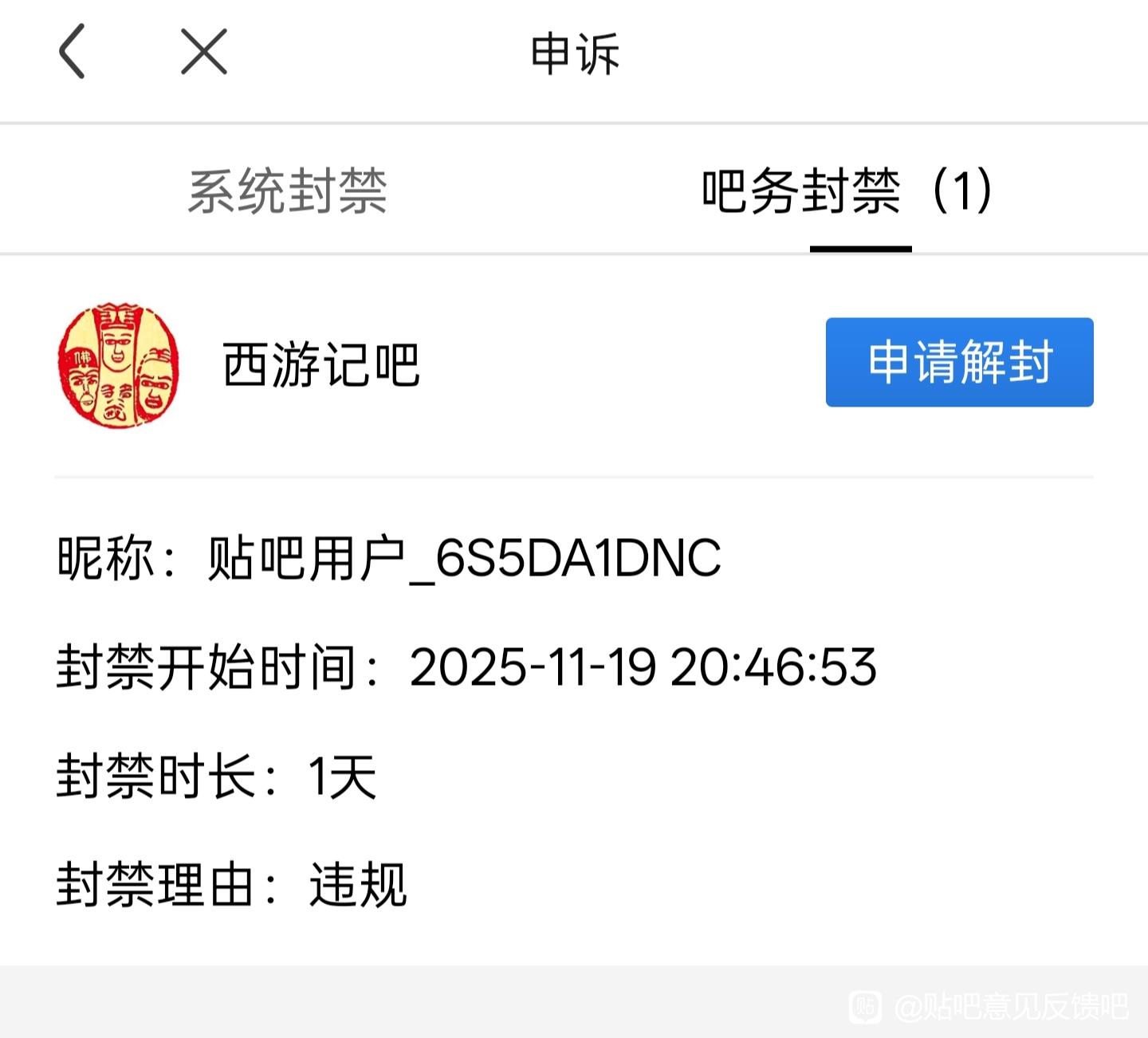 1楼pid:1528398211342025/11/10 09:32:26微笑苦瓜yyds贴吧用户_6S5DA1DNC 楼主 1级 【10-12 | 求助咨询】西游记吧吧...西游记吧从今年8月27日开始,一直到今天。2个月过去了,基本每天固定时间点封禁,怀疑使用脚本封禁。不然时间怎么这么准呢?而且是无理由乱封禁,我一没有违规二没有骂人,到底为什么循环封禁?@逍遥帮帮主 @玛雅♤天神 @铁血小队长 @阿丝忒希娅 @清夜吟