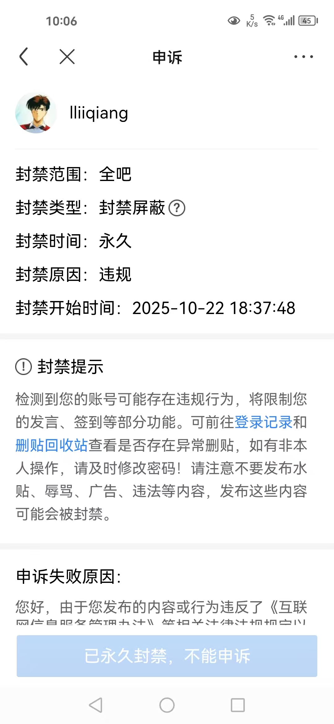 贴吧意见反馈吧 我得到lliiqiang账号被贴吧永久封禁请求解封tid:102015572392025/11/10 10:09:22101137 2 0楼主:科学知识架构 贴吧用户_Q4Vy3b7最后回复:鸭鳄452025/12/03 14:47:281楼pid:1528399434202025/11/10 10:09:22科学知识架构贴吧用户_Q4Vy3b7 楼主 1级 一直支持中国,被封禁,请求解封。17年了,做过一些贴吧的吧主,还充过SVIP会员费。2楼pid:1528400861302025/11/10 10:50:16科学知识架构贴吧用户_Q4Vy3b7 楼主 1级 @贴吧阿Sir@贴吧Madam3楼pid:1528406811582025/11/10 13:52:01丶鹧鸪哨凯文德布劳㚈6级 百度乱封号4楼4条pid:1528408636572025/11/10 14:49:20细雨7飘飘🍀细雨7飘飘🍀5级 刚加了贴吧小助手的企业威信,回复要集中处理。科学知识架构 贴吧用户_Q4Vy3b7 楼主 1级 我其实不在乎账号被封禁,但是我可惜的是我的一些好帖子没有了。什么叫做集中处理?怎么处理?细雨7飘飘 🍀细雨7飘飘🍀 层主 5级 回复 贴吧用户_Q4Vy3b7 :我现在也不清楚,先等等再说。丶鹧鸪哨 凯文德布劳㚈6级 集中处理需要申请吗5楼pid:1528414005682025/11/10 17:30:52科学知识架构贴吧用户_Q4Vy3b7 楼主 1级 @贴吧阿Sir@贴吧Madam6楼pid:1528421997752025/11/10 21:40:24科学知识架构贴吧用户_Q4Vy3b7 楼主 1级 互联网投诉平台很搞笑,说没有封禁,但是现在还封禁呢。7楼pid:1529298896132025/12/03 14:47:28鸭鳄457级 国家信访局看看