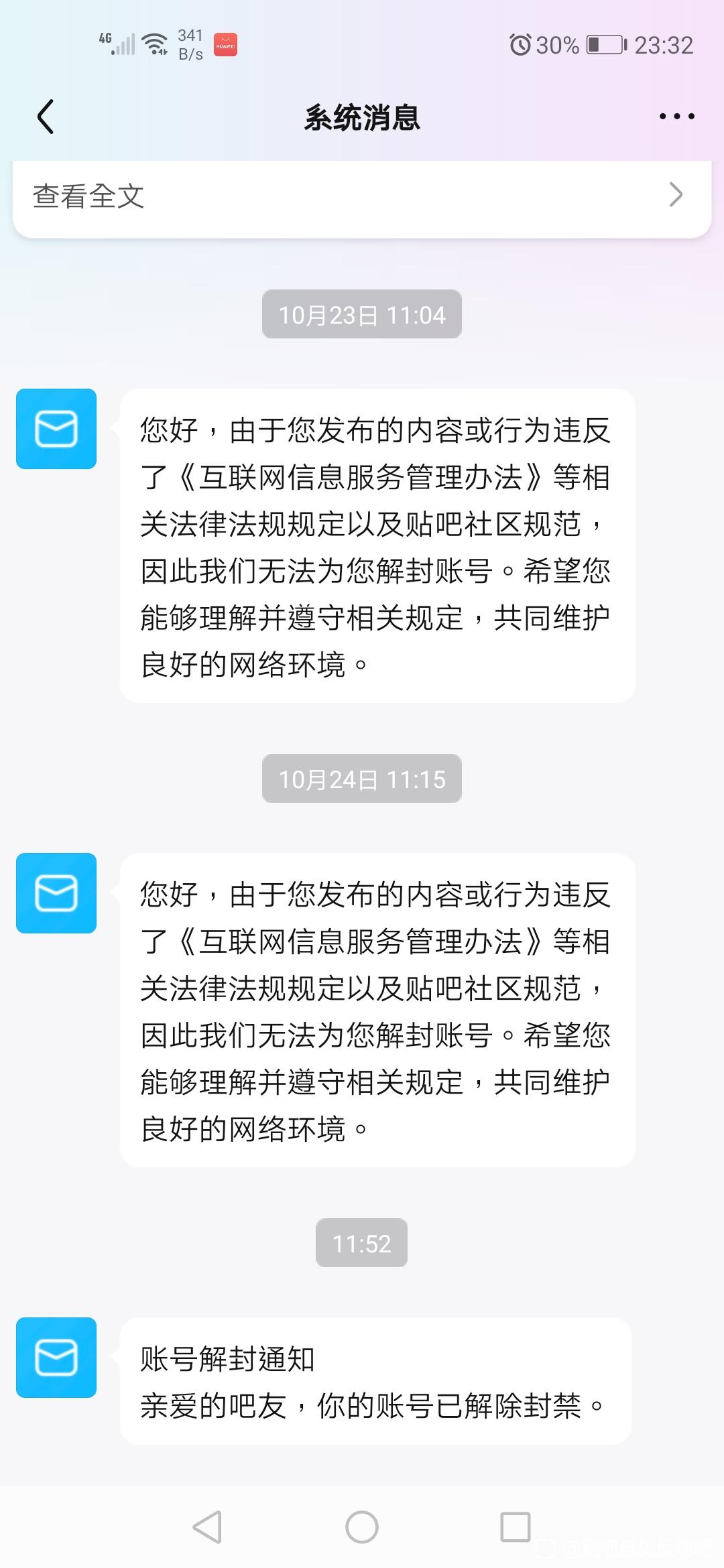贴吧意见反馈吧 【Android反馈】哭了,居然把我放出来了tid:102030706072025/11/10 21:05:01333535 4 0楼主:雾香·楼兰 ◆飞燕红儿◆最后回复:执行者No_202025/12/03 11:34:581楼pid:1528420844172025/11/10 21:05:01雾香·楼兰◆飞燕红儿◆ 楼主 8级 贴吧极速版客户端8.0.0.0, 15, MEIZU Note 16, WIFI:刚才用别的账号看帖,偶然看到我这个被封的账号的帖子,心里一激动,这不是放出来了?不然帖子怎么可能出现,赶紧登陆一看还真是2楼pid:1528420883682025/11/10 21:06:09雾香·楼兰◆飞燕红儿◆ 楼主 8级 3楼pid:1528421147832025/11/10 21:14:08奇迹再现ZY1级 我也是4楼pid:1528421419662025/11/10 21:22:22挥洒寂寞闯天涯轮回无尽1级 真好,是怎么做到的?5楼pid:1528424557882025/11/10 22:57:01偷者如JACEEEE1级 为啥6楼pid:1528425550982025/11/10 23:25:53佚名291级 你有做過申訴的事情嗎?反正本人大號至今尚未解封。7楼2条pid:1528425680922025/11/10 23:29:46红尘过客8884级 怎么做到的?红尘过客888 层主 4级 用什么理由解封的?狡诈蓝星人 浮姬马鹿1级 回复 贴吧用户_JQ42KUa :没有任何理由,突然就通知说解封了8楼pid:1528426374352025/11/10 23:51:07x135339992501级 怎么做到的9楼5条pid:1528426929812025/11/11 00:07:11执行者No_2013级 啊?这次你也被封了啊。我这次倒没被波及,但以前已经被永封过两次了,所以现在一有风吹草动就会紧张雾香·楼兰 ◆飞燕红儿◆ 楼主 8级 还好哪来的小丑2级 你之前永封两次咋解开的执行者No_20 层主 13级 回复 哪来的小丑 :第一次封了很久,虽然申诉很早但一直没消息,找关系去问也没个结果。大约过了一星期悄然解开,虽然没有任何解释。第二次大约是因为封得实在荒唐一眼误伤,到第二天上午就解开了。所以看起来如果账号行为确无异常是被误封,就正常去申诉,要过一段时间等人工审到你就能解封了。汗血松风 模仿大师1级 回复 执行者No_20 :你在这里看到过usg石村号吗执行者No_20 层主 13级 回复 汗血松在这边没见过风 :10楼pid:1528432654132025/11/11 07:28:39细雨7飘飘🍀细雨7飘飘🍀5级 怎么成功的?11楼pid:1528433603872025/11/11 08:12:35zjh19116784521南风っ晓月8级 ???12楼pid:1528433811322025/11/11 08:20:37想要眼熟你1级 为什么你能申诉4次13楼pid:1528435538542025/11/11 09:16:59爆风机器MLOVEK5级 羡慕了14楼pid:1528439844002025/11/11 11:21:11包灭蟑螂吞没深渊7级 我一直未解封,投诉都没有用15楼1条pid:1528443924272025/11/11 13:26:01水绕长安城阿水新号1级 真的???鸭鳄457级 都是19点前的16楼pid:1528446284432025/11/11 14:41:06剑压星河谁堪敌1级 我今天突然解封了17楼pid:1528448048682025/11/11 15:34:17秋晚先生1级 哥我出来了18楼1条pid:1528448108482025/11/11 15:36:03我爱小吉子1爱意有几分。1级 我也出来了雾香·楼兰 ◆飞燕红儿◆ 楼主 8级 恭喜19楼pid:1528449797012025/11/11 16:27:20细雨7飘飘🍀细雨7飘飘🍀5级 我也解封了。20楼2条pid:1528449973102025/11/11 16:32:35yjhss915兮兮筱漫漫❄️7级 我也是,感动了 以后不敢说话了雾香·楼兰 ◆飞燕红儿◆ 楼主 8级 这又不是我们乱说话的问题,本来就是百度抽风yjhss915 兮兮筱漫漫❄️ 层主 7级 回复 ◆飞燕红儿◆ :就怕再抽风啊,怕了怕了21楼pid:1528463862312025/11/11 23:34:14佚名943狗⽇的中元之涯1级 果然我解封了,@佚名29 乃本人小號。22楼pid:1528611583902025/11/15 21:27:54浮夸DE乱世浮夸DE乱世🌈4级 为啥我没有 靠了23楼pid:1528684961112025/11/17 18:32:32寻找往日足迹14级 我也被放出来了24楼pid:1529289653092025/12/03 10:19:00love宁珂宁珂寂寞沙洲冷12级 我收到过解封消息,但是我没有真的被解封