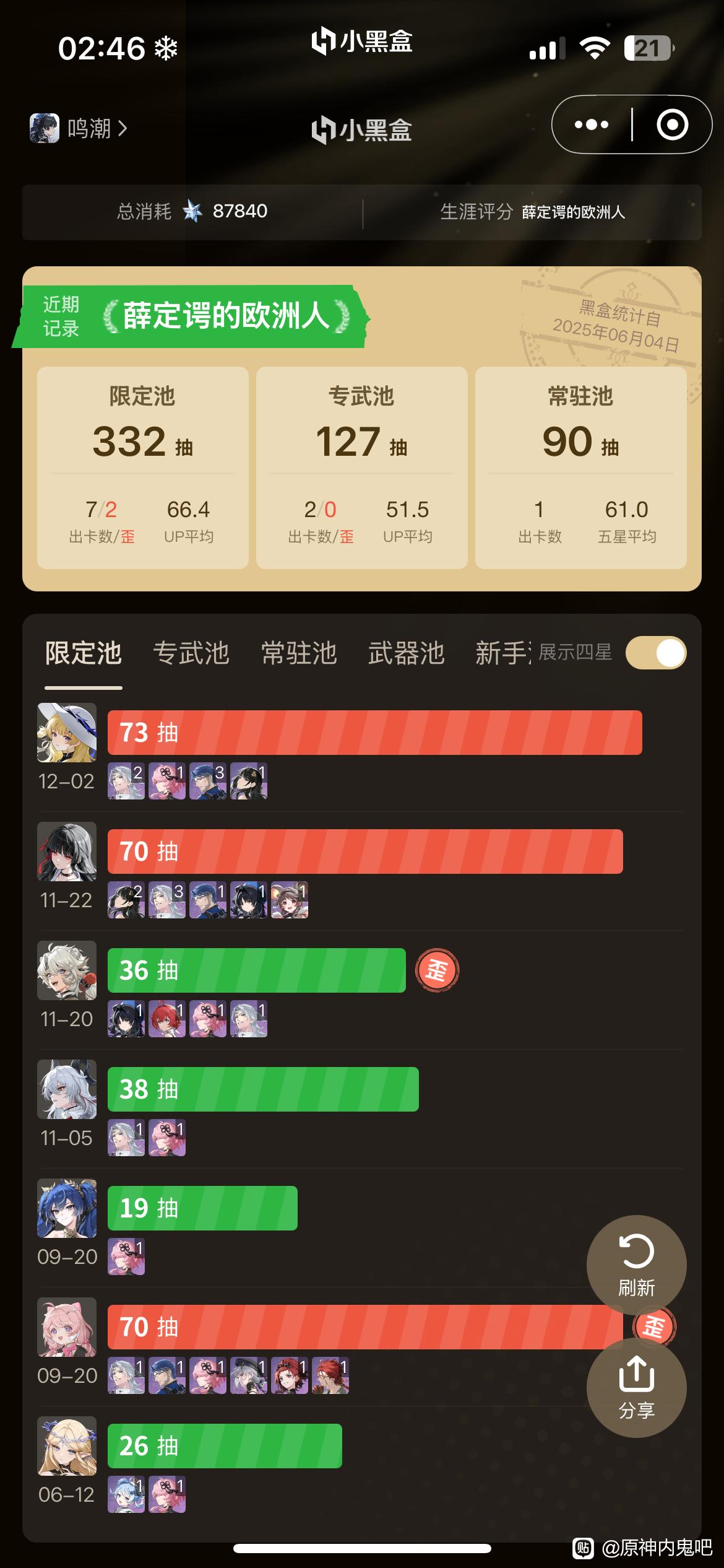 你要是能单拎出全是送的五星,或者全是常驻打满深渊12层,老子当场跪下认你爹。先等等,好像鸣倒可以哟。