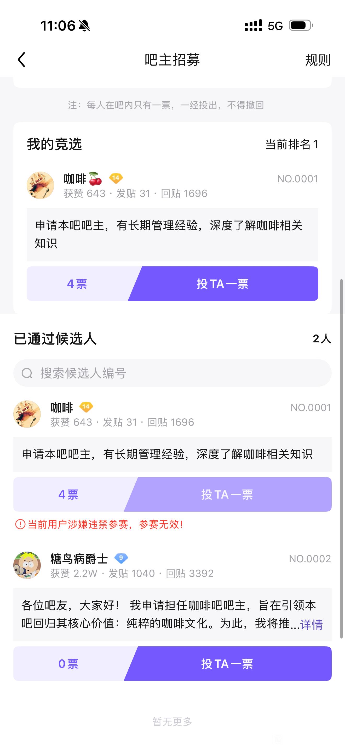 贴吧吧主吧 【11-19+|+求助咨询】竞选违规是什么意思?tid:102260271022025/11/19 11:48:13191872 5 0楼主:风残晓露晨难依 咖啡最后回复:从GV拆分没想到没地😲😳2025/12/06 10:28:401楼pid:1528750203602025/11/19 11:48:13风残晓露晨难依咖啡 楼主 1级 吧友愿意给我投票也不行吗2楼1条pid:1528750402242025/11/19 11:53:58贴吧爱欢迎关注常驻1级 是的,你违规卸任吧主,要三个月以后才可以申请风残晓露晨难依 咖啡 楼主 1级 那就不要通过我的申请啊3楼pid:1528750411992025/11/19 11:54:16贴吧爱欢迎关注常驻1级 正常考核不通过是可以掉了以后立即申请4楼pid:1528750432062025/11/19 11:54:50单身保平安吧๑◔㉨◔ิ๑8级 应该是之前因为违规被贴吧处罚撤销吧主,所以一段时间内不能上任5楼pid:1528750538212025/11/19 11:57:56菩提不是罪3级 多了解贴吧知识6楼pid:1528751378392025/11/19 12:23:55雪宫冰花10级 7楼1条pid:1528751997292025/11/19 12:42:49乐观的hddhh古今來9级 这是哪个吧,这个id 好眼熟风残晓露晨难依 咖啡 楼主 1级 咖啡8楼pid:1528752270802025/11/19 12:51:20pikemm︀皮克猪9级 你这是被卸任以后用同一个号竞选吗9楼5条pid:1528755263962025/11/19 14:24:58vvhvgdhcdd悟往追来12级 因为你是因为违规被下任吧主的 吧主因违规下任的 180天不允许再次上任 这个时候去参选就属于违禁参赛koiyuig 卡蜜儿重生之陆之昂!3级 问一下投诉吧主怎么投诉是在吧里发帖子艾特吧主或者是你吗?vvhvgdhcdd 悟往追来 层主 12级 回复 卡蜜儿重生之陆之昂! :就在吧简介里面投诉就行 在哪个渠道都一样回复 卡蜜儿重生之陆之昂! :个人投诉吧主基本上不会成功 处罚吧主触碰红线或者大批量用户举报才会下任回复 卡蜜儿重生之陆之昂! :个人投诉吧主基本上不会成功 除非吧主触碰红线或者被大批量用户举报才会下任koiyuig 卡蜜儿重生之陆之昂!3级 唉谢谢10楼pid:1528755284192025/11/19 14:25:32vvhvgdhcdd悟往追来12级 符合申请要求 就可以申请吧主 但是未满180天 不允许上任11楼pid:1528759423682025/11/19 16:25:48初瑞雪rx书拭3级 12楼pid:1529249686742025/12/02 09:55:42从GV拆分齐天大圣之混世魔王10级 13楼pid:1529413151962025/12/06 10:28:40从GV拆分齐天大圣之混世魔王10级