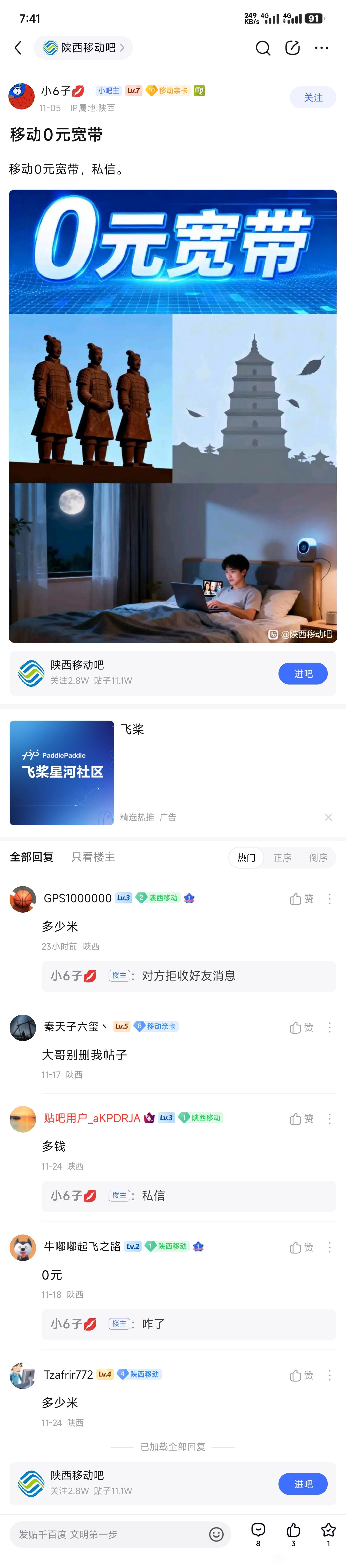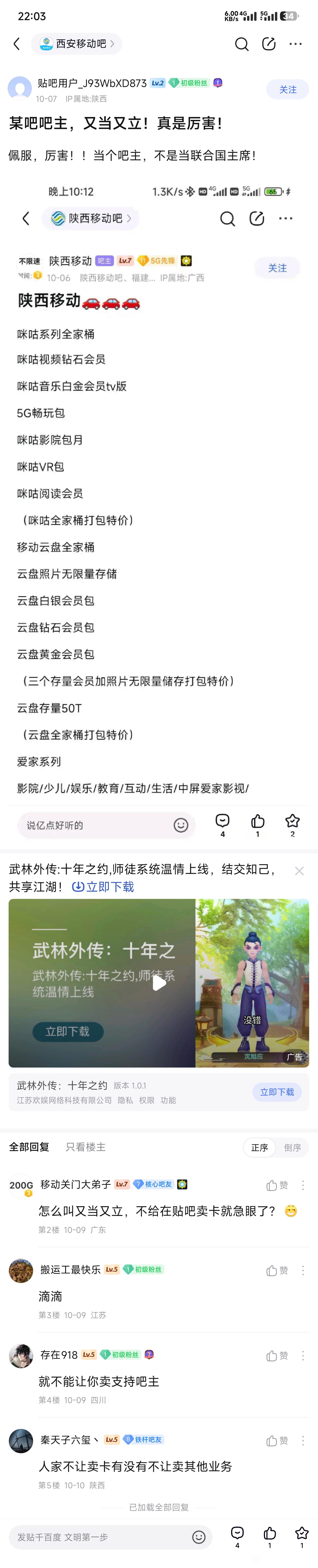 1. 【利用职务之便发布商业广告,涉嫌牟利】 该吧主长期、多次以官方发布的形式,在“陕西移动吧”内发布大量业务广告(证据详见附件截图),内容包括但不限于: · “10元400G”流量包业务:声称“免费办理”,但实则涉及复杂的消费返现模式,要求用户“每月保证月有118以上扣就行”,并存在“上车2个月不能退v网”等限制条件。 · “0元宽带”业务:小吧主“移动亲卡”同样公开发布“移动0元宽带”广告,并引导用户“私信”。 · 售卖账号与套餐:公开叫卖“8元移动双不限”账号,并标明“已开5GA流量包20元10GB”,“用不上可以自己退”。 · 其他付费服务:如“云手机”、“云电脑”、“监控云储存”、“积木0”等系列业务。 其行为本质是利用了吧主的公信力和影响力,在其管理的贴吧内进行商业推广和经营活动,这严重违背了吧主职责。2. 【滥用管理权限,行为不当,破坏社区公平】 该吧主在自身大量发布广告的同时,必然利用其吧务权限(如删帖、封禁)打压其他发布广告或与其形成竞争关系的用户。这种行为正是典型的 “只许州官放火,不许百姓点灯” ,严重破坏了贴吧的公平、公正环境,损害了其他用户的正常权益。3. 【涉嫌发布虚假或误导性广告】 其宣传的“0元”、“免费”等业务,实际附带有复杂的消费条件和资金风险(如先扣后返、要求保底消费等),容易对用户产生误导,涉嫌违反《广告法》中关于虚假广告的规定。