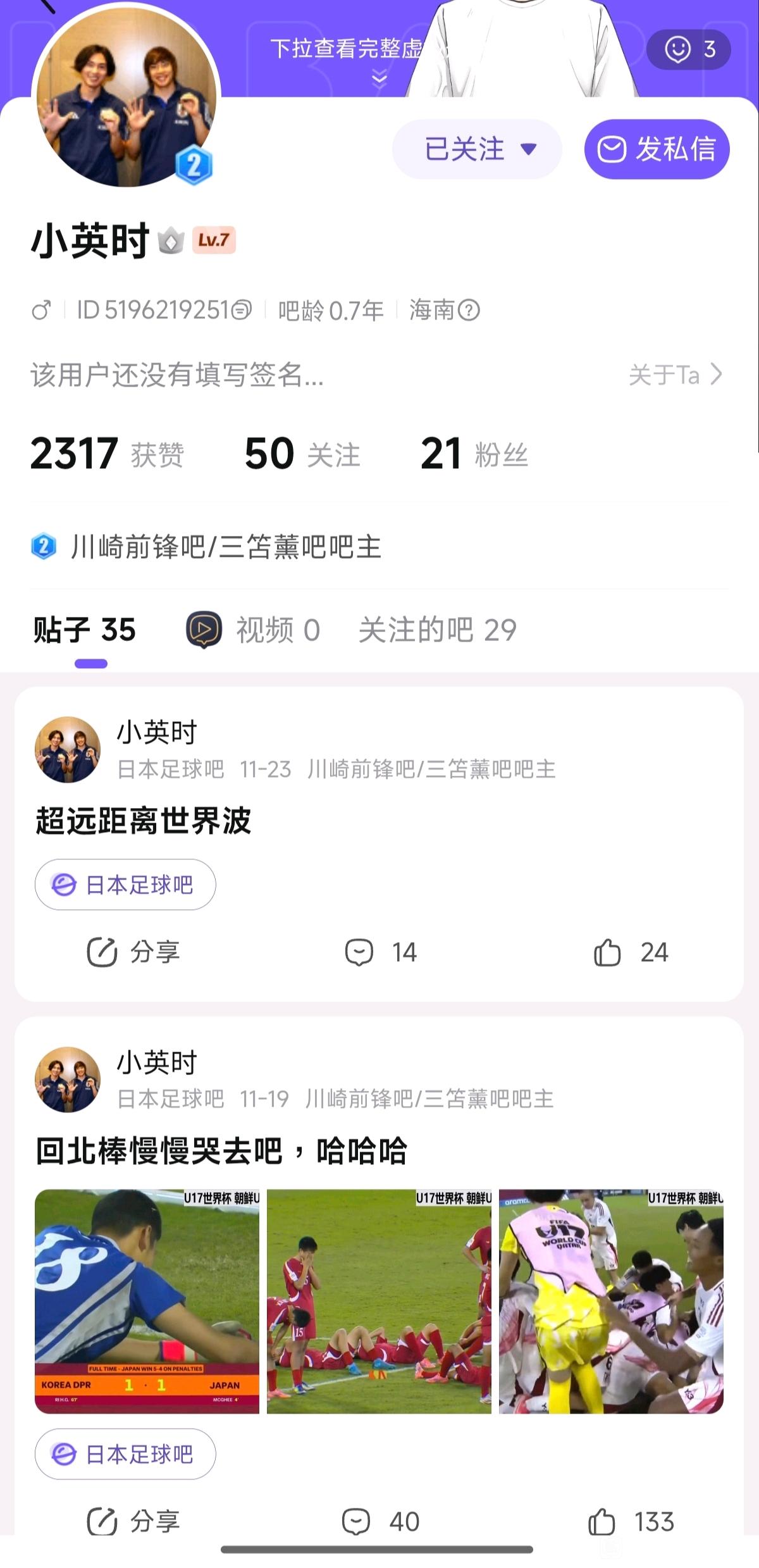 1楼pid:1529193703712025/11/30 20:31:45给喵喵做绝育偏偏♋ 楼主 1级 因为我发了相关日本球员最近高举日本二战法西斯战犯照片的新闻,某球员贴吧吧主直接私信说要开盒我,并威胁开盒我全家,并多次改名开小号骚扰我他原贴id小英时,第二次改名英时灭海参,第三次改名爱国青年英时,小号叫小英时秽土重生