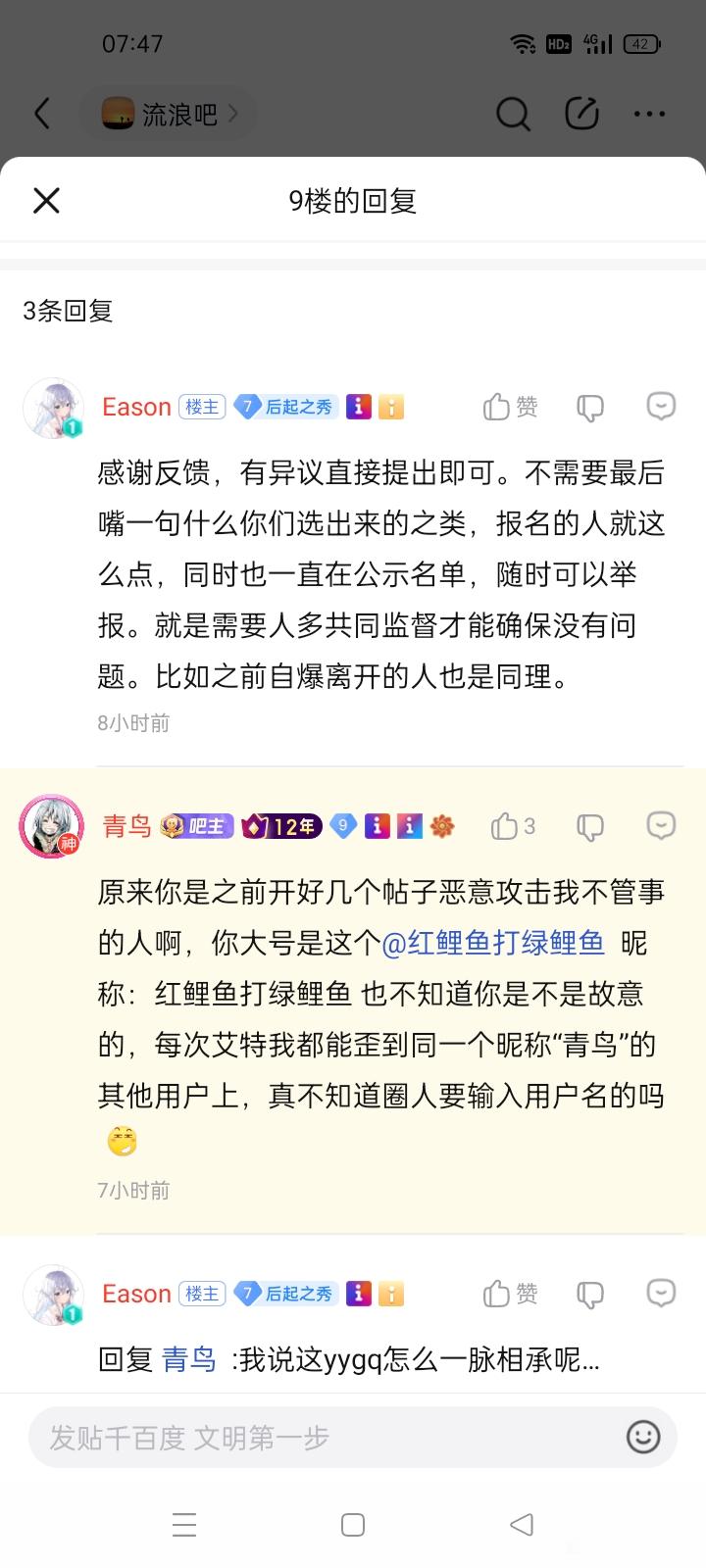 给我整笑了,请问你怎么不敢在截图的流浪吧竞选吧务打卡监督帖里回复我,或者任何应急吧务?