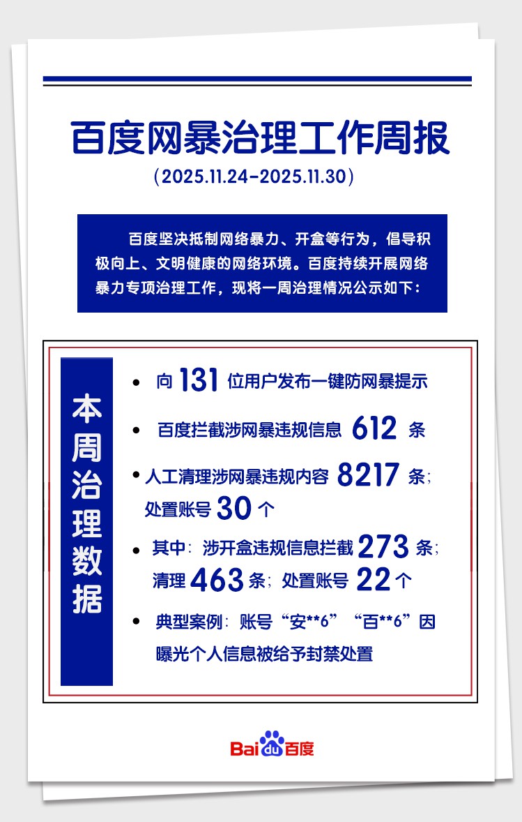 1楼pid:1529222983122025/12/01 15:43:47贴吧阿Sir 楼主 吧主13级 百度坚决抵制网络暴力行为,倡导积极向上、文明健康的网络环境。现将一周治理情况公示如下:百度将持续防范和坚决打击网络暴力行为,对参与传播网暴的账号予以惩戒处置。同时,百度也在持续优化产品功能,帮助用户积极开展自我防护。详见《百度防网暴手册》https://tieba.baidu.com/p/9411381067让我们携起手来,共同抵制网络暴力行为,共建清朗文明网络空间。百度贴吧2025年12月1日