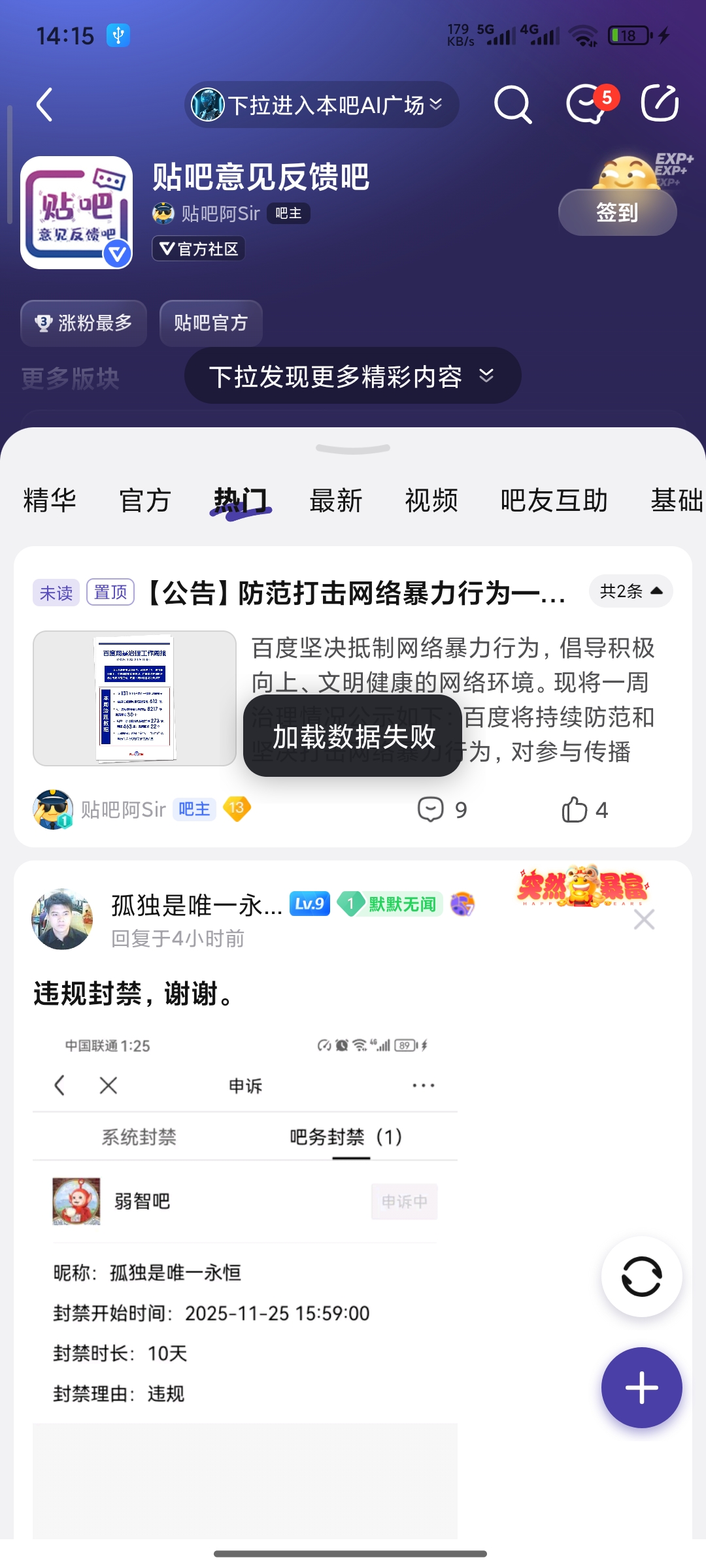 起始页贴吧意见反馈吧 标题5个字tid:102636688512025/12/02 14:16:241288 2 0楼主:全汉字用户名 文明网友10086最后回复:全汉字用户名贴吧用户_aMMEAV62025/12/04 20:29:151楼pid:1529258280932025/12/02 14:16:24全汉字用户名文明网友10086 楼主 3级 一签到就提示加载数据失败是怎么回事啊?2楼pid:1529352047952025/12/04 20:29:15全汉字用户名文明网友10086 楼主 3级 问题解决了,我将贴吧的数据清空,再重新登陆一遍就可以签到了