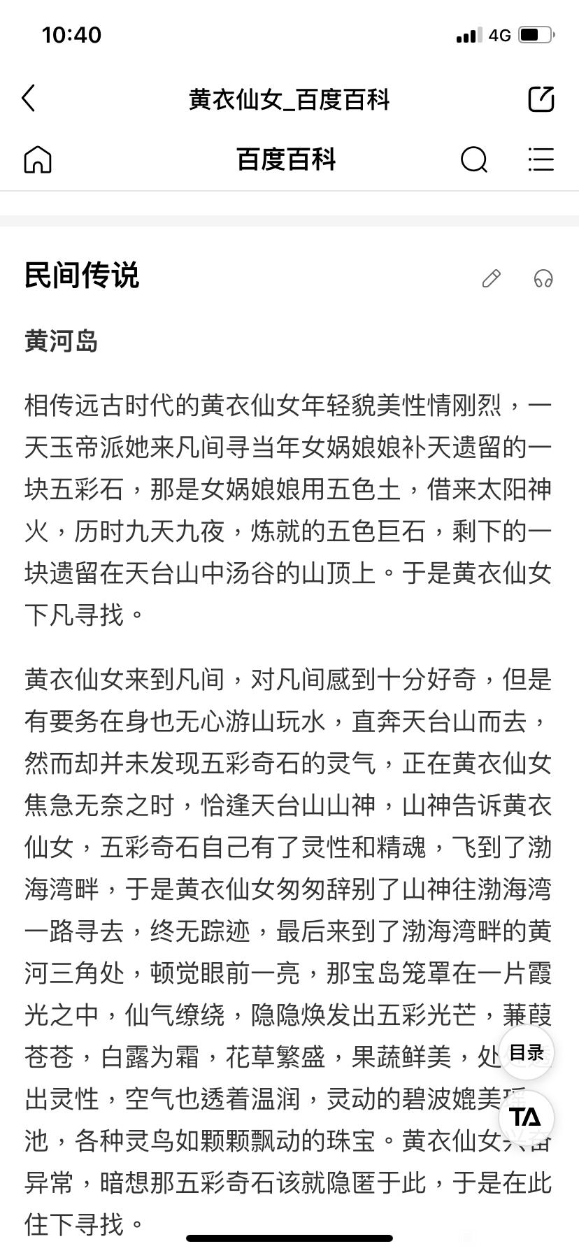 黄衣仙女来到凡间,对凡间感到十分好奇,但是有要务在身也无心游山玩水,直奔天台山而去,然而却并未发现五彩奇石的灵气,正在黄衣仙女焦急无奈之时,恰逢天台山山神,山神告诉黄衣仙女,五彩奇石自己有了灵性和精魂,飞到了渤海湾畔,于是黄衣仙女匆匆辞别了山神往渤海湾一路寻去,终无踪迹,最后来到了渤海湾畔的黄河三角处,顿觉眼前一亮,那宝岛笼罩在一片霞光之中,仙气缭绕,隐隐焕发出五彩光芒,蒹葭苍苍,白露为霜,花草繁盛,果蔬鲜美,处处透出灵性,空气也透着温润,灵动的碧波媲美瑶池,各种灵鸟如颗颗飘动的珠宝。黄衣仙女兴奋异常,暗想那五彩奇石该就隐匿于此,于是在此住下寻找。