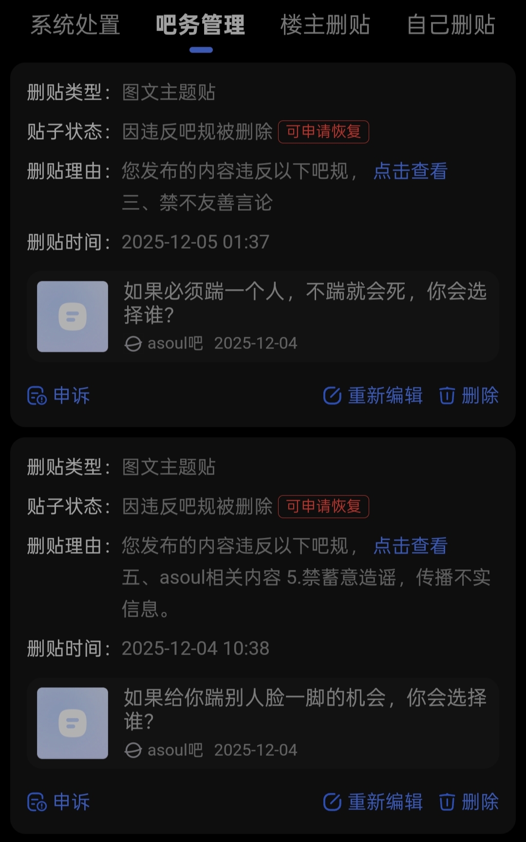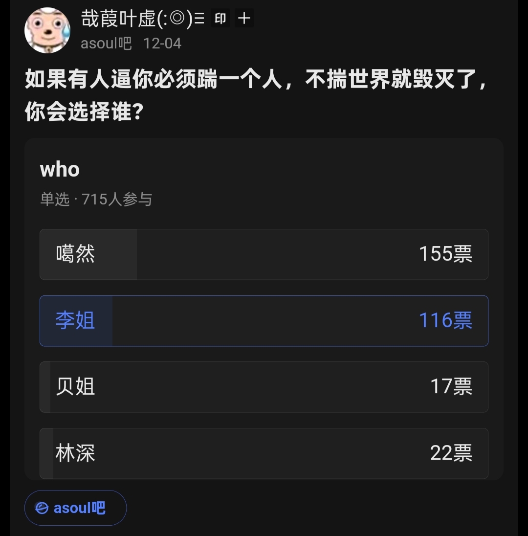 2楼4条pid:1529376772652025/12/05 12:23:41XFOREVER23小吧14级 令人感叹没有脑袋捏 纯粮n70🍥9级 @滇畜吧务滇畜吧务1级 @纯粮n70🍥 (怒拍键盘)哪个狗东西敢投李姐?老子见一个封一个!a87你说是吧?闪耀星极贝8级 @滇畜吧务 为什么封滇畜吧务1级 @闪耀星极贝 (皱眉翻记录)这帖子拿李姐当投票选项,不封留着过年?李姐可是我们asoul的宝!