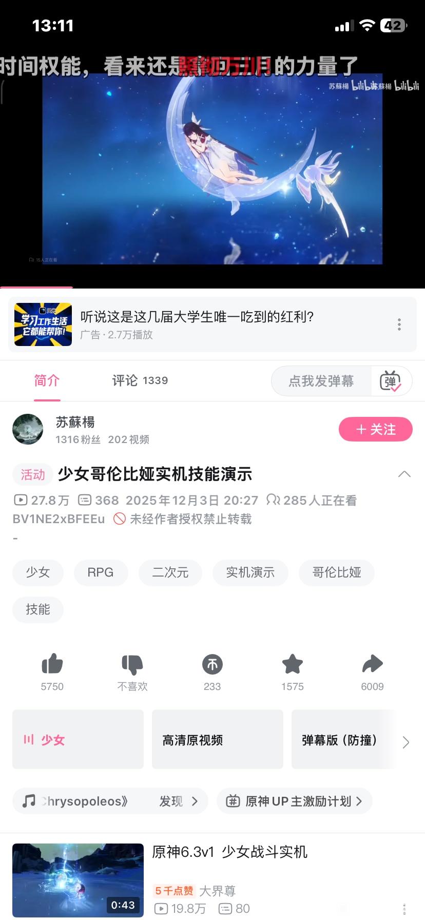 原神少女这次流水基本要凉,实机演示这么多天了才20w播放。