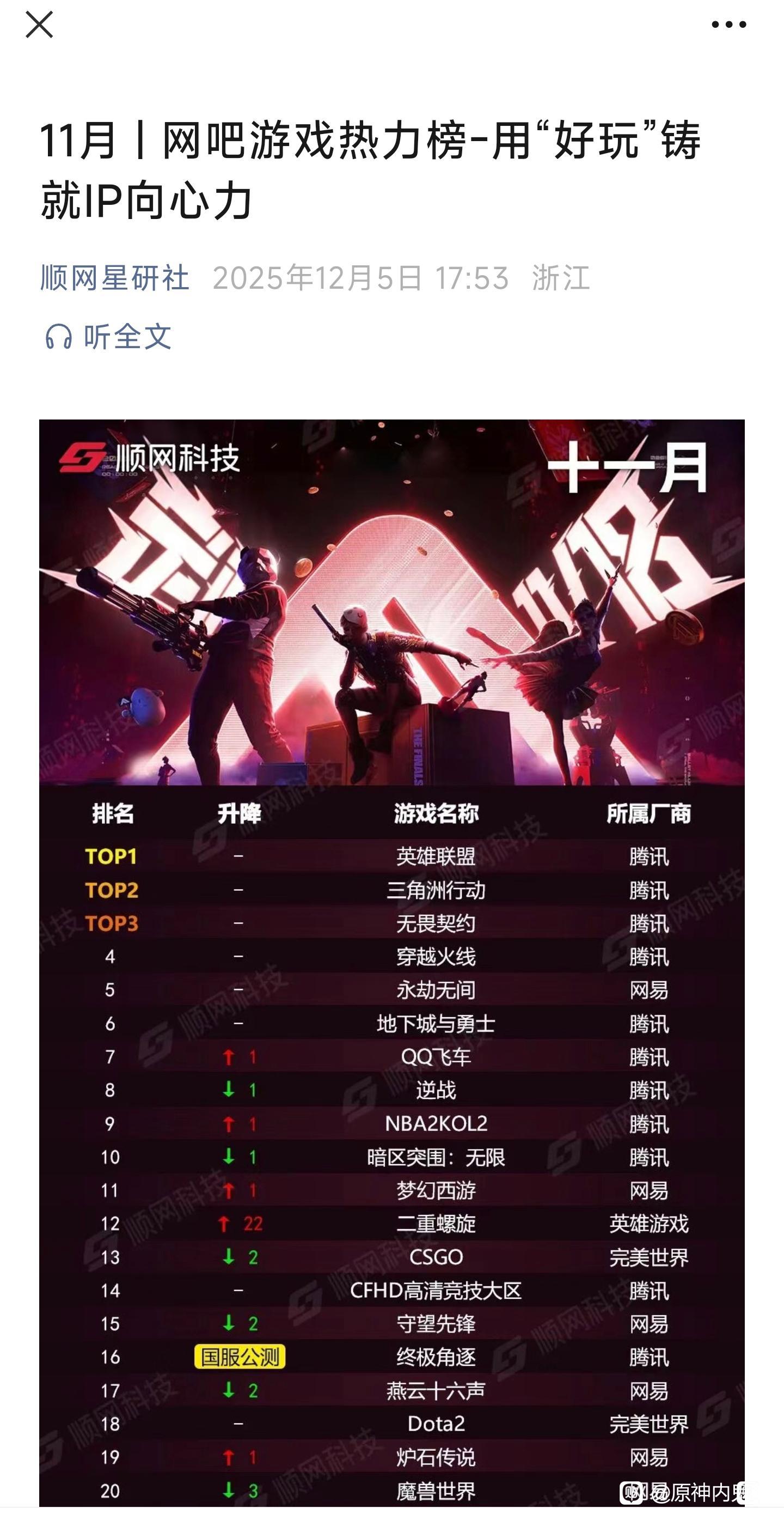 原神内鬼吧 二重螺旋11月上榜网吧热力榜第十二名,如何评价?tid:102739583822025/12/05 22:35:1111849 1 0楼主:987477923 ZTRQ最后回复:Nishio_Yuka2025/12/06 02:18:131楼pid:1529398421382025/12/05 22:35:11987477923ZTRQ 楼主 6级 本以为是路边一条的游戏在意想不到的地方出现了。2楼pid:1529398626552025/12/05 22:40:31候塞给0必胜客的盘子,11级 远超鸣潮开服,而且终极角逐刚开服的竞技游戏居然打不过二重螺旋,有点出乎意料3楼1条pid:1529398628432025/12/05 22:40:34童谣484恶魔使徒1008610级 我去这个榜是按什么算的?再见永远的eVa 阿巴怪。12级 启动次数,游戏时长这些。国内大部分网吧用的都是顺网,这榜还是很权威的4楼pid:1529399327852025/12/05 22:59:14呵呵呵呵呵8943符生如梦º7级 能活就行,我还玩呢5楼pid:1529399719172025/12/05 23:09:27123456qq6001级 很努力的活着6楼pid:1529399826662025/12/05 23:12:16驾照就考科目四7级 有点NB7楼pid:1529400753172025/12/05 23:37:17嗷嗷君丶有翻翻鸽的话就好办了1级 有点意外8楼pid:1529400906962025/12/05 23:41:24救苦救难方劳模孤傲魔头🎏1级 祝好9楼pid:1529401610642025/12/06 00:00:47努力的乌尔缇燃烧的心1级 不是很能理解,12名也太高了10楼pid:1529404908202025/12/06 01:50:17串串香。8级 我还在玩着呢。这游戏手游一坨,但是端游属于还不错。剧情演出的打光,微表情,运镜比zmd强。11楼pid:1529405407492025/12/06 02:18:13Nishio_Yukaおゆちゃん1级 qq飞车第七?确实意想不到