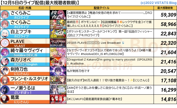 vtuber吧 2025.12.5tid:102740489612025/12/05 23:24:479729 0 0楼主:泽塔kiss 莉·泽塔😺kiss小吧15级 最后回复:贴吧用户_GX5MXUZ2025/12/06 02:50:081楼pid:1529400292952025/12/05 23:24:47泽塔kiss莉·泽塔😺kiss 楼主 小吧15级 【1万以上枠数】14枠ホロ6枠(さくらみこ, さくらみこ, 白上フブキ, 綺々羅々ヴィヴィ, 森カリオペ, 博衣こより)VLAST1枠(PLAVE)にじ4枠(剣持刀也, フレン・E・ルスタリオ, 葛葉, 葉山舞鈴)BraveGroup3枠(一ノ瀬うるは, 橘ひなの, 小森めと)2楼pid:1529401117922025/12/05 23:47:05路过的野兔子33野兔崽子🐰10级 该称枫皇了😎3楼pid:1529401302642025/12/05 23:52:08kdygsunnyokepok7级 vivi 崛起4楼pid:1529401875082025/12/06 00:06:49真神紫衣月夜寒风1级 兔头今天休播,好像是因为身体不适,这种接近一年无休狂播411场的卷王模式早晚会出问题,想拿下今年的总视听目前来看很难了,不如休假一段时间调整状态。5楼pid:1529402644412025/12/06 00:26:27coelacanth_I黎老大爷🔥12级 他们以前都叫我枫太后6楼pid:1529402898242025/12/06 00:34:06会飞的猫翅膀Knight🐰8级 虽然牢兔在也是被踩头,但是没有牢兔牢孕简直是在乱杀。7楼pid:1529404387752025/12/06 01:26:35SWhiteCheng東南海島見證奇兵8级 恭喜Vivi上桌8楼pid:1529404947682025/12/06 01:52:17Okamisama改8级 即宣传了自家app又给大空警察造了梗,真是个人才9楼pid:1529404954572025/12/06 01:52:38Sssakuramiko11级 兔田小姐不会沉迷holo ADV导致今天忘了开直播吧10楼pid:1529405860372025/12/06 02:50:08沉没之胡德v28级 🐰痛失好句局