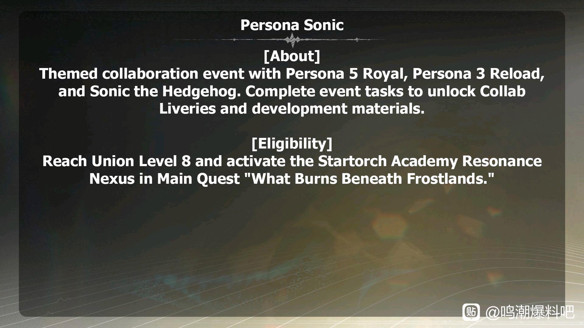 1楼pid:1529404109462025/12/06 01:15:43晒卡死个吗砂狼黒子 楼主 7级 以下内容为机翻:此联动主题活动与《女神异闻录5 皇家版》、《女神异闻录3 重制版》及《索尼克》系列合作。完成活动任务,即可解锁**联动主题涂装**与养成素材。**参与条件**工会等级达到8级,并激活**星炬学园共鸣**。来源:Wuthering Wives联动活动给的奖励差不多就是摩托涂装和车载音乐