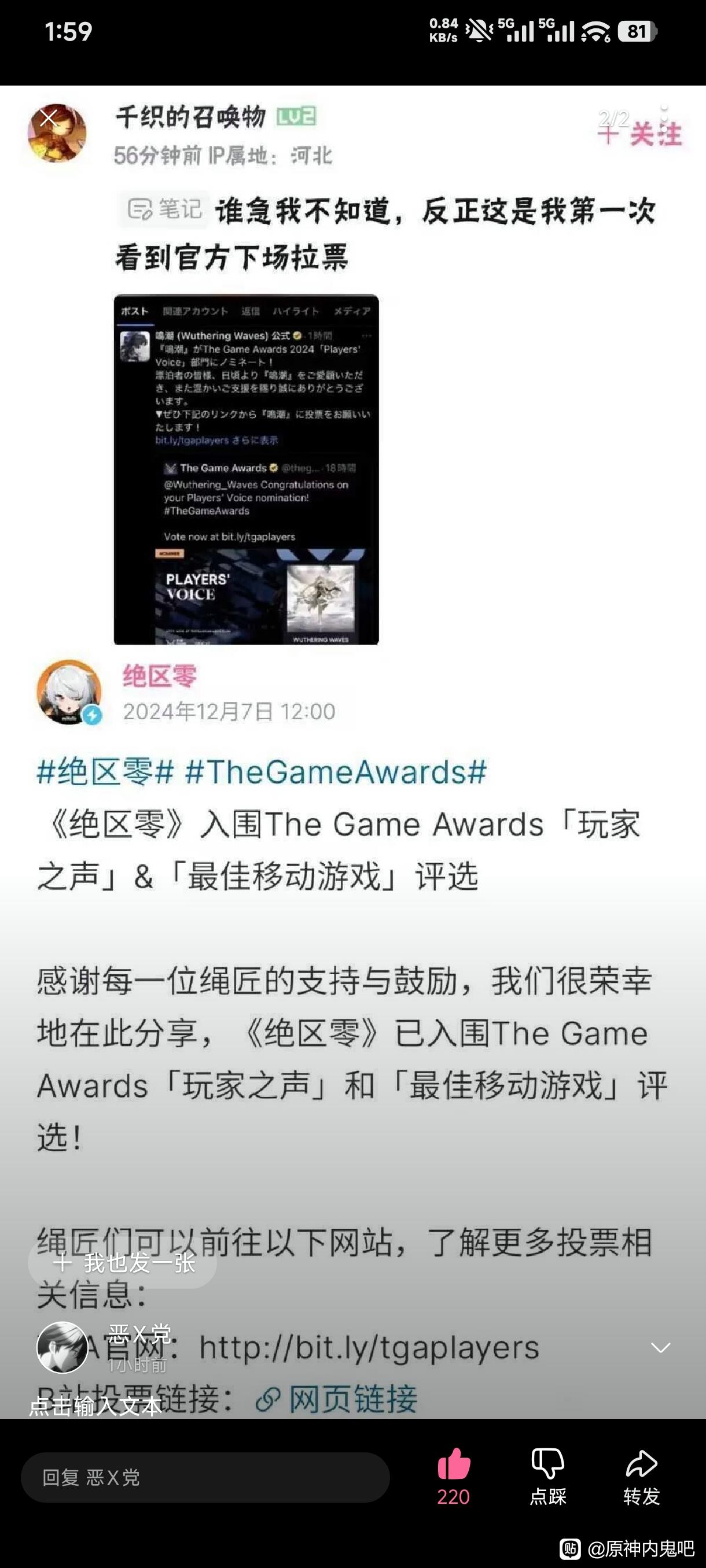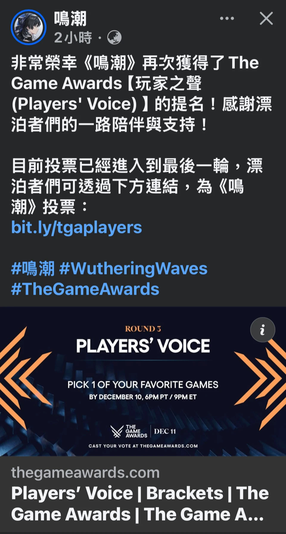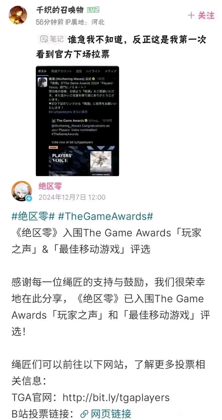 米哈游在之前获得了两次媒体、制作人奖,获得了业界人员的高度肯定,而鸣潮靠官方、KOL疯狂拉票拿玩家之声,甚至把33号这个zzzq游戏都挤下去了,可见买量力度有多大,这个含金量也不用我多说了