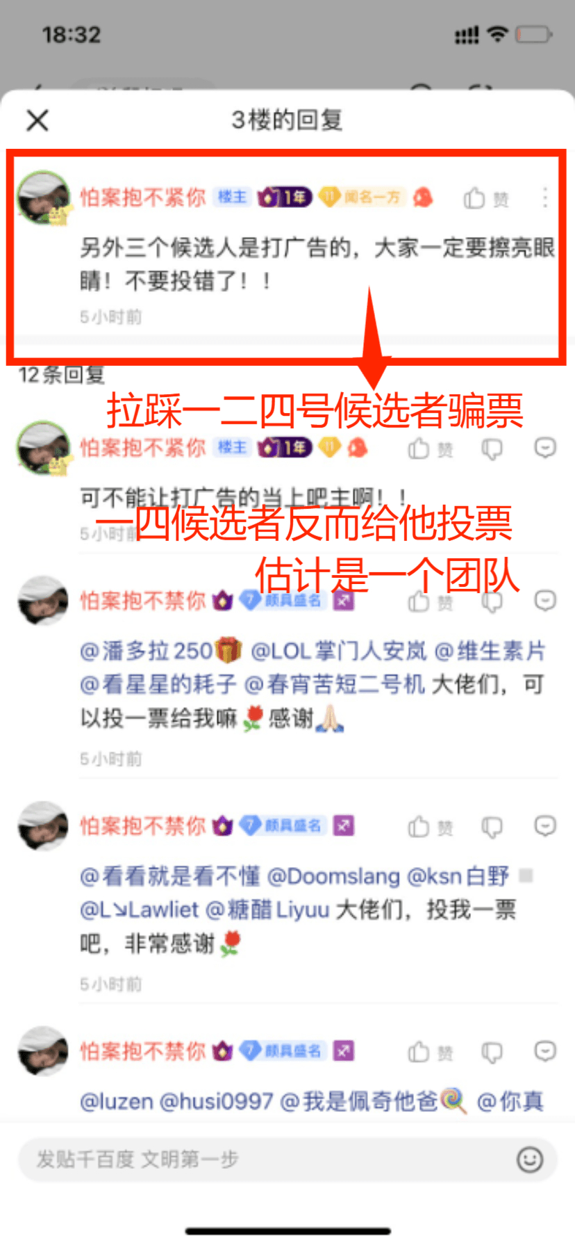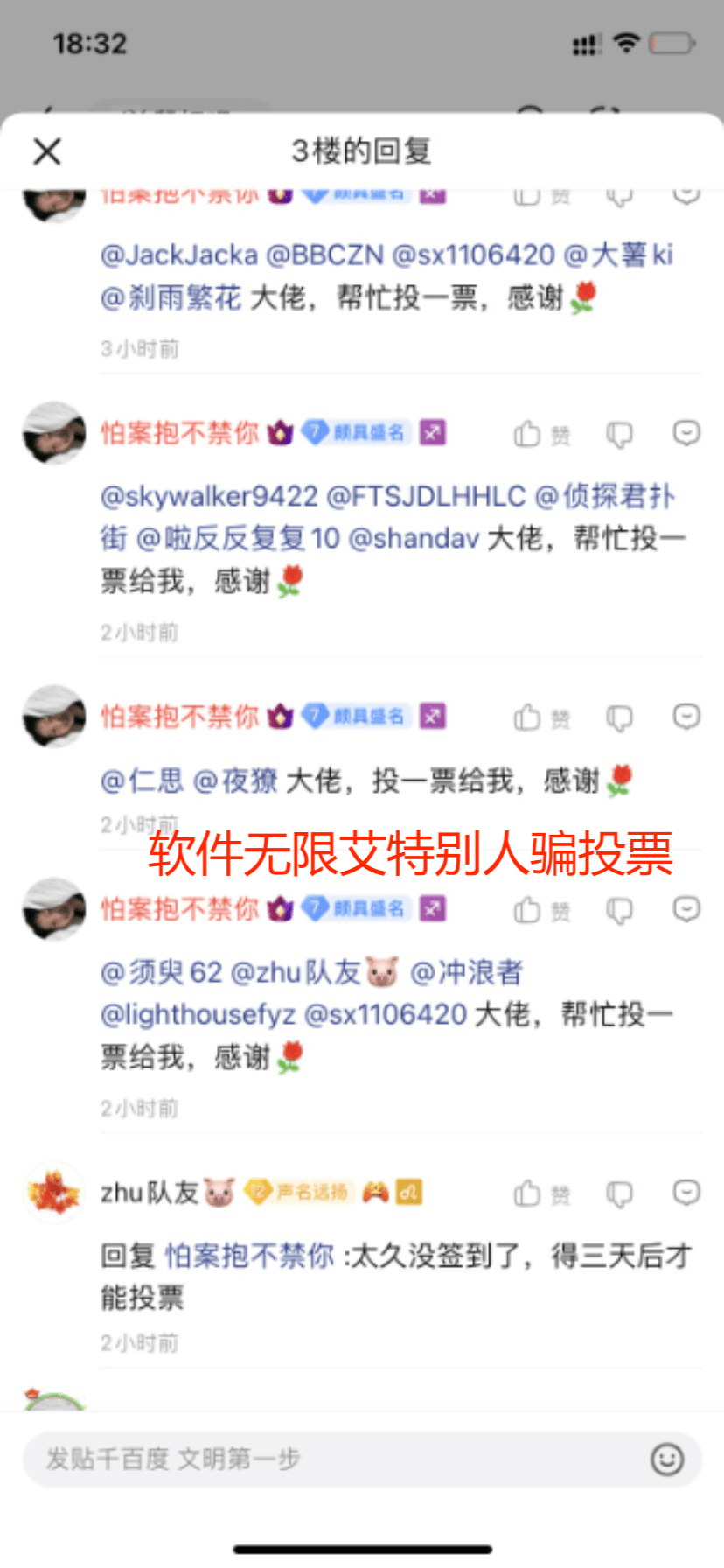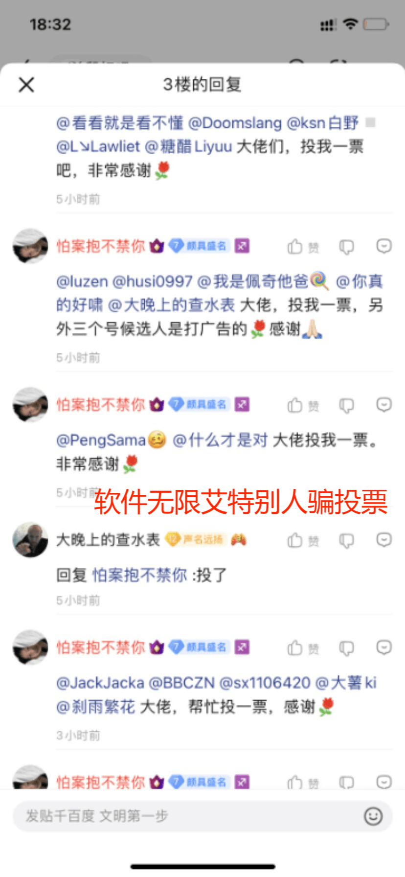 1楼pid:1529764422862025/12/14 15:58:42外设推荐 楼主 9级 鼠标吧吧主选举作弊,134号候选者是一个团队,3号骂别人都是广告,14号反而投票给他,经过深扒,是一个占吧发广告的团队,证据如下图