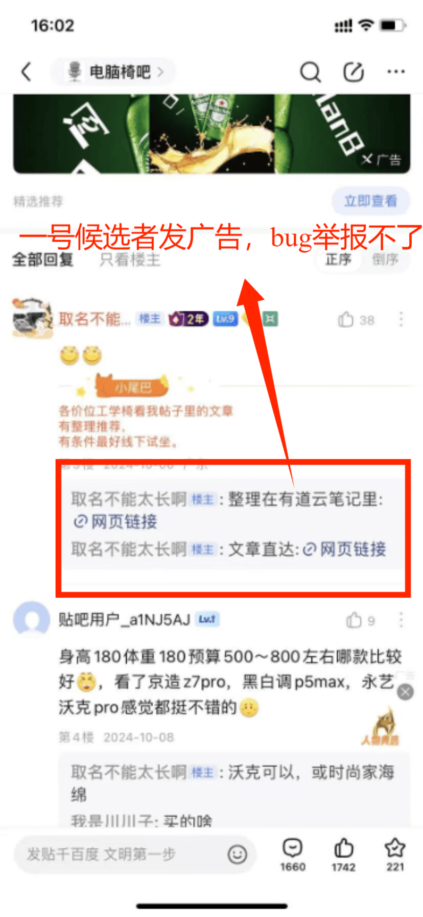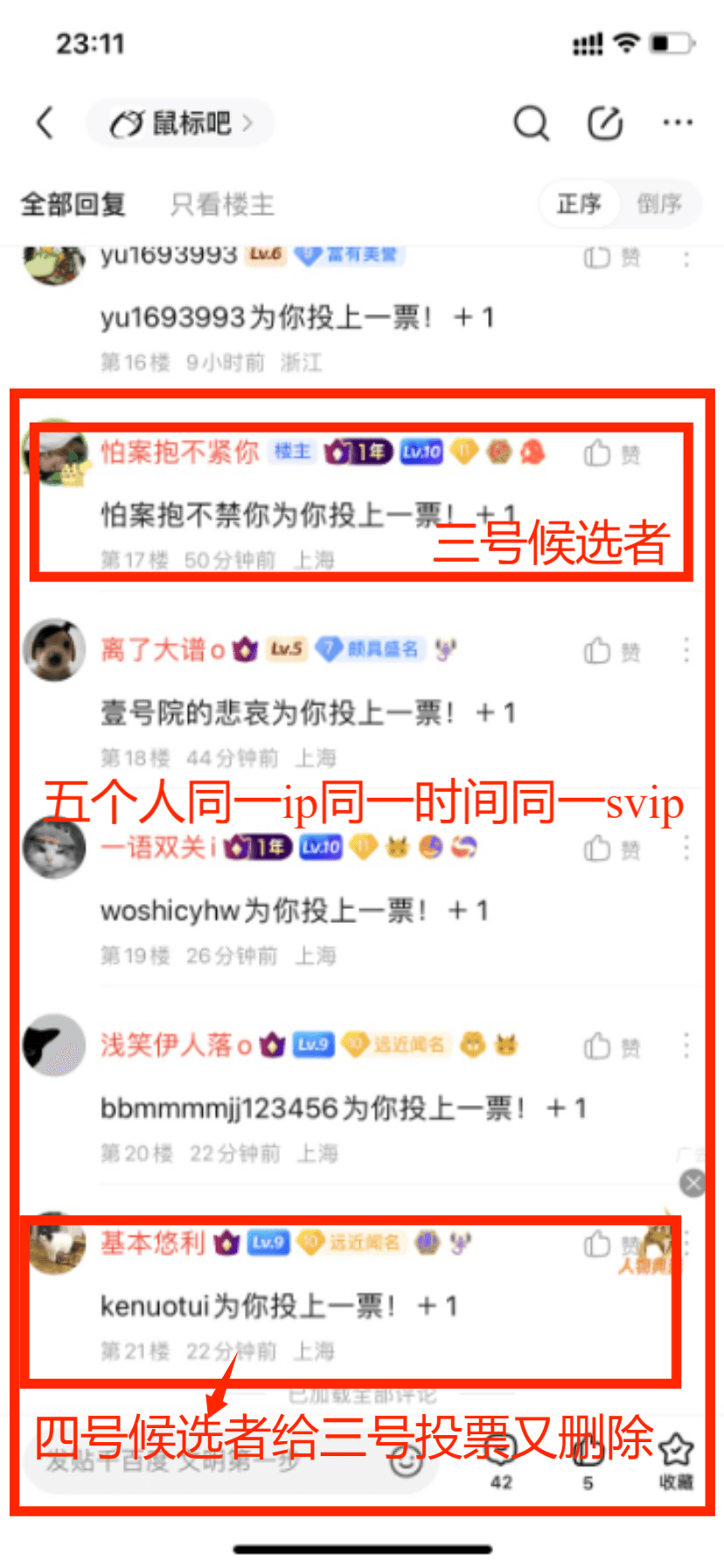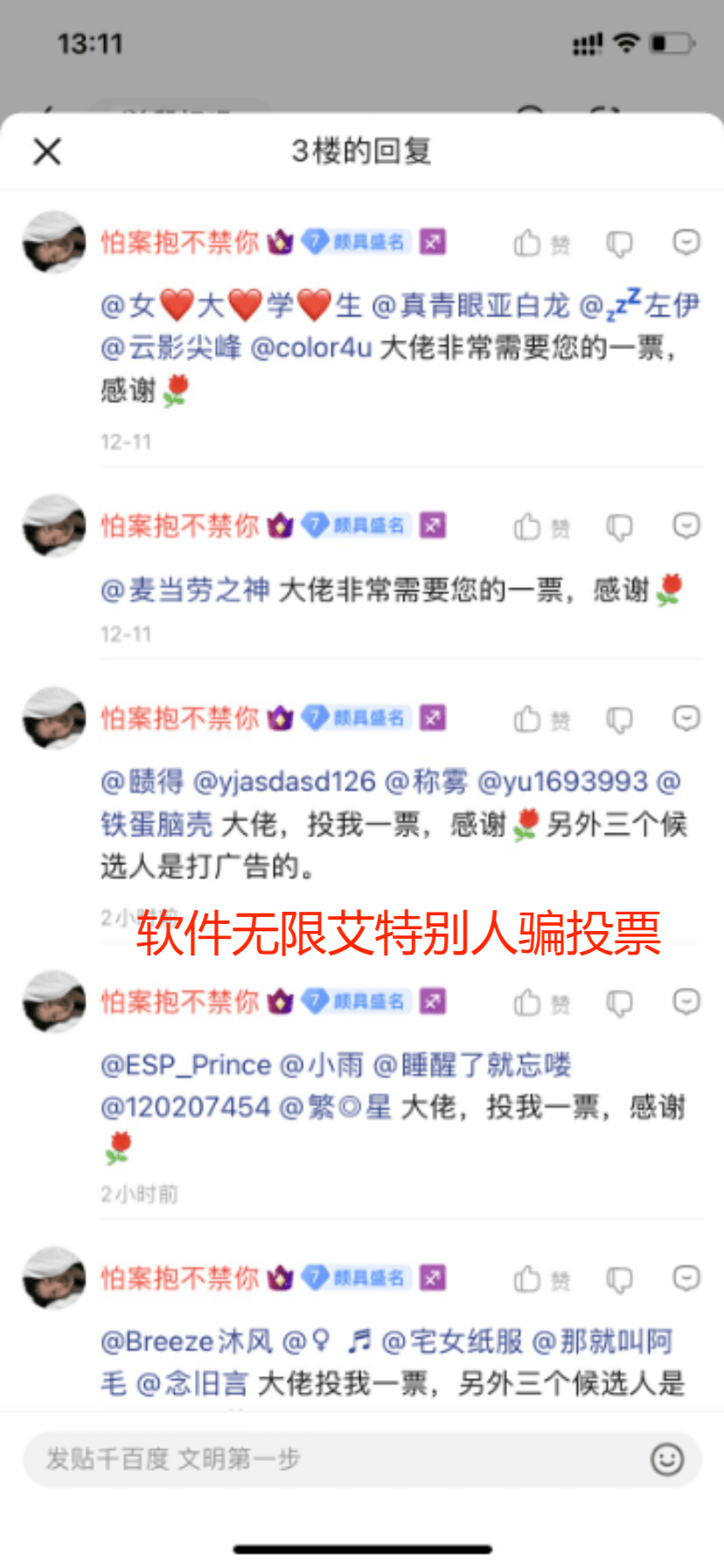 1楼pid:1529764422862025/12/14 15:58:42外设推荐 楼主 9级 鼠标吧吧主选举作弊,134号候选者是一个团队,3号骂别人都是广告,14号反而投票给他,经过深扒,是一个占吧发广告的团队,证据如下图