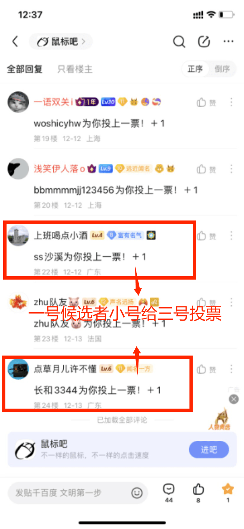 起始页贴吧意见反馈吧 广告团队作弊获取吧主tid:102998670622025/12/14 15:58:425347 0 0楼主:外设推荐最后回复:外设推荐贴吧用户_5a3eM4b2025/12/19 12:47:031楼pid:1529764422862025/12/14 15:58:42外设推荐 楼主 9级 鼠标吧吧主选举作弊,134号候选者是一个团队,3号骂别人都是广告,14号反而投票给他,经过深扒,是一个占吧发广告的团队,证据如下图2楼pid:1529764492882025/12/14 16:00:40外设推荐 楼主 9级 @贴吧吧主小管家3楼pid:1529764498552025/12/14 16:00:50外设推荐 楼主 9级 @贴吧阿Sir4楼pid:1529767485212025/12/14 17:22:55clairelutianyi17级 刷票刷得不多的话只是最后结算的时候把刷的票清掉,不取消竞选资格的。5楼pid:1529823350682025/12/15 22:37:14外设推荐 楼主 9级 @贴吧阿Sir6楼pid:1529823360732025/12/15 22:37:31外设推荐 楼主 9级 @贴吧吧主小管家 @贴吧吧主小秘书7楼pid:1529963965952025/12/19 12:47:03外设推荐 楼主 9级 @贴吧吧主小秘书 @贴吧吧主小管家 @贴吧阿Sir