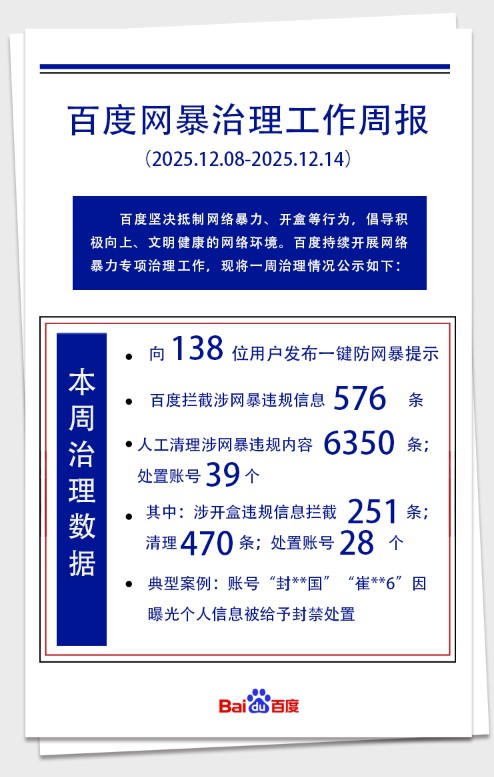 1楼pid:1529808187272025/12/15 15:28:15贴吧阿Sir 楼主 吧主13级 百度坚决抵制网络暴力行为,倡导积极向上、文明健康的网络环境。现将一周治理情况公示如下:百度将持续防范和坚决打击网络暴力行为,对参与传播网暴的账号予以惩戒处置。同时,百度也在持续优化产品功能,帮助用户积极开展自我防护。详见《百度防网暴手册》https://tieba.baidu.com/p/9411381067让我们携起手来,共同抵制网络暴力行为,共建清朗文明网络空间。百度贴吧2025年12月15日