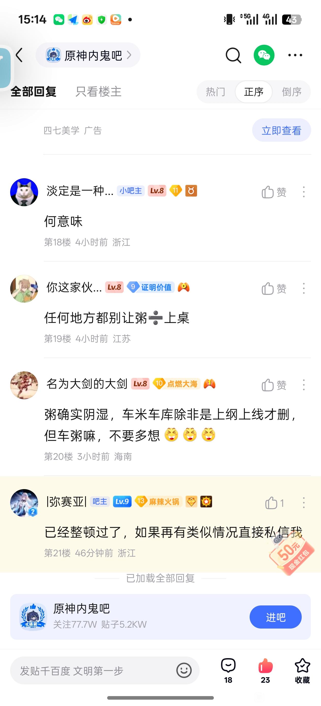 原神内鬼吧 喜报,原神内鬼吧大自由车粥时代已经到来tid:103027563092025/12/15 15:29:0591179 1 11 0楼主:串串香。最后回复:给给力先升2025/12/19 13:28:141楼pid:1529808219992025/12/15 15:29:05串串香。 楼主 9级 各位开拓者,漂泊者,舰长,指挥官,绳匠,分析员,旅行者,少东家,决斗者,痒痒鼠,司辰,老师,骑士君,侦探,吃瓜纯路人们。大家好。这里是原神内鬼吧。如今内鬼吧开展车粥特别活动,为诸位提供自由车粥场所。给予粥p吧务,看你不爽,删你不得的酥脆体验。吧主弥将会护航你的自由搏击。2楼1条pid:1529808637352025/12/15 15:40:26淡定是一种美77小吧11级 游戏还没上呢。串串香。 楼主 9级 车粥粥人车着玩呗。最近粥粥人那么跳,多有乐子呀。3楼pid:1529810485772025/12/15 16:31:13last_order01🌹修普林凯勒14级 老弥神了4楼pid:1529810544682025/12/15 16:32:47罓优ミカ_9级 5楼pid:1529810614862025/12/15 16:34:40汐汐希希嘻希希汐汐嘻2级 本来也就是串着玩的,直接下场搞权限。直接加深刻板印象了6楼pid:1529810988332025/12/15 16:45:11艾蕾伊士塔尔1级 ?原鬼吧吧务还有玩粥的?7楼pid:1529811024352025/12/15 16:46:10又能怎么ban又能怎么办。1级 利刃出鞘🗡️9楼pid:1529811417442025/12/15 16:57:15Phoenix乱世派蒙!最好的伙伴!11级 老🦅神了10楼pid:1529965307022025/12/19 13:28:14给给力先升7级 且听🦅惊