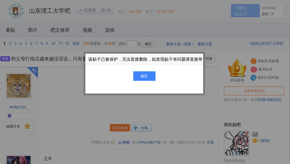 1楼pid:1529840078672025/12/16 11:13:21千静铃 楼主 1级 @Molly0103_ 此人在各大高校发布求助帖子,不断有机器人回复帖子挖坟,导致正常帖子全都沉下去,吧务和吧主都删除不了这些帖子,会显示帖子受到保护,无法删除,希望尽快解决