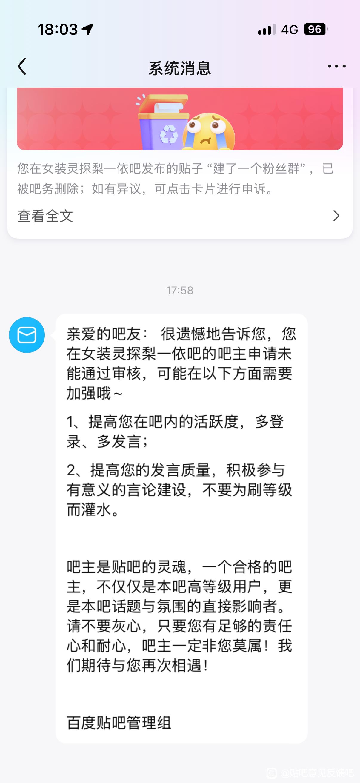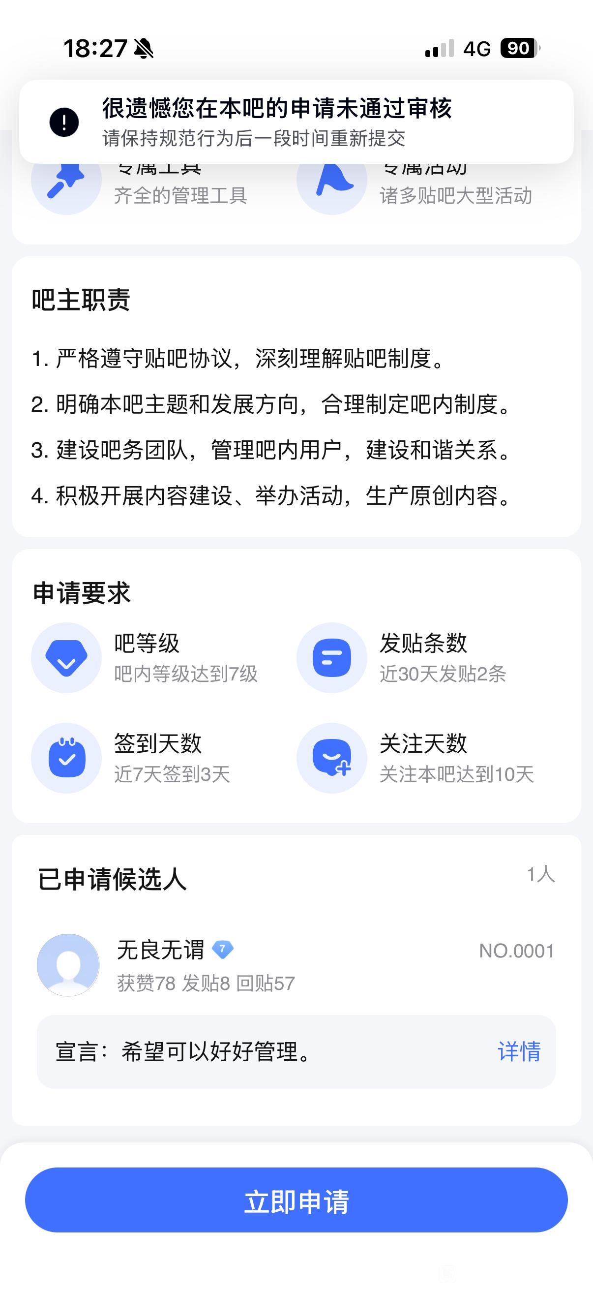 但是最近他又弄了个号,先是发了个问答帖还暗示自己有资源,但回答的内容牛头不对马嘴,资源也完全没有发,但是他凭借着帖子的流量和热度开始又开始参选吧主了。我们其他吧友都没有选过吧主不知道有什么前置条件慌忙申请结果全都被驳回。