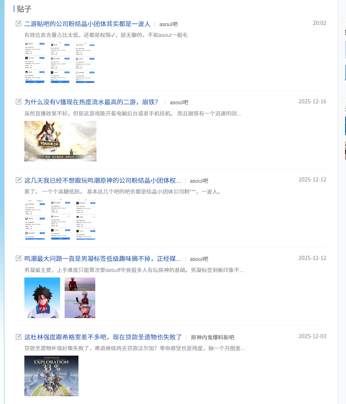 asoul吧 二游贴吧的公司粉结晶小团体其实都是一波人tid:103129781842025/12/18 20:02:45261150 5 0楼主:即使天空不蓝最后回复:lris838 下青-2025/12/19 07:27:031楼pid:1529938836902025/12/18 20:02:45即使天空不蓝 楼主 5级 有效信息含量占比太低,还都是权限✔,挺无聊的,不如asoul一根毛2楼2条pid:1529939027142025/12/18 20:08:34执笔话王八阿ya✨4级 你怎么做到的即使天空不蓝 楼主 5级 小团体其实都是一伙的,原龟吧的鸣小子破防了,就慢慢的让这些贴吧都捂嘴十循了执笔话王八 阿ya✨ 层主 4级 其他吧呢3楼2条pid:1529939045422025/12/18 20:09:09bot二号机1级 😇串了这么久发现还是A8好,只有A87会把你当宠物,其他吧只会当也够即使天空不蓝 楼主 5级 好像做嘉然小姐的鼠鼠bot二号机 层主 1级 回复 即使天空不蓝 :可是然比喜欢的是花枝鼠4楼2条pid:1529939123142025/12/18 20:11:39东翻西阅go10级 你说了什么能让两边都拉黑的即使天空不蓝 楼主 5级 小团体是一伙人贴吧用户_J79JSVU1级 一边是米孝子 另一边是米逆子。5楼2条pid:1529939166352025/12/18 20:13:02林一鸣jyf677总是肚饿真君7级 我只看到了一个失败的串子在无能狂怒怎么别人能游龙呢即使天空不蓝 楼主 5级 “我说话刻薄吗,只是实话实说罢了,接受不了的人才该自己反思原因”林一鸣jyf677 总是肚饿真君 层主 7级 回复 即使天空不蓝 :这就不奇怪了,这就不奇怪了6楼1条pid:1529939196152025/12/18 20:13:58芦叶白沙1级 还差两个吧,明日方舟吧和明日方舟终末地吧,这样你就能集齐米库鹰三家之力了即使天空不蓝 楼主 5级 不爱玩,没办法7楼pid:1529939222242025/12/18 20:14:49MYDRIAT0笠っちLover5级 怎么还是学不会在op吧当op 在kg吧当kg这种简单的道理8楼pid:1529939288242025/12/18 20:16:55有爆有爆7级 列入重点观察名单9楼pid:1529939340242025/12/18 20:18:28有爆有爆7级 😅10楼pid:1529939363352025/12/18 20:19:12千变common球里鳖载着理发店💈4级 本来就是一波人,只不过立场不同罢了不跟op一样极端哪来的战力反op11楼pid:1529939371722025/12/18 20:19:26a85640368嘉然最可爱😄12级 还是来a8串吧12楼2条pid:1529939386792025/12/18 20:19:52__炼狱__庭院__5级 别的不说,圆规吧自由搏击也能被封啊,你是不是嘴了哪个85了即使天空不蓝 楼主 5级 很阴湿的,那个吧的吧务,还隔几天去找我以前的帖子删,我好像是原龟吧十一级还是十二级lris838 下青-1级 回复 即使天空不蓝 :你串zmd了?圆规吧都能封啊13楼2条pid:1529940334142025/12/18 20:48:52jollymmtj凉拌绯玉丸😄6级 还发两遍帖子,真当互联网没记忆,这么多天还耿耿于怀呢?闹麻了jollymmtj 凉拌绯玉丸😄 层主 6级 串子发一遍大伙还能评价一句,发两遍只能说你是个🤡了即使天空不蓝 楼主 5级 回复 凉拌绯玉丸😄 :把前面的删了不就完了吗?14楼pid:1529940821762025/12/18 21:03:43yosafire123贴吧用户_096NZ7V12级 怎么做到的15楼pid:1529944098712025/12/18 22:38:49嘉然向晚suki然小鹅小吧14级 你这不简单,a8也得盯着你了16楼1条pid:1529944920102025/12/18 23:01:50你今生今世吗wlhs1级 ?能被两边完全不同的封,你是真的神了精确化_tchi s2.s.t211级 不是二游圈基操?17楼pid:1529950351632025/12/19 02:15:00繁华落木0丰巛祥梓6级 那很无敌了