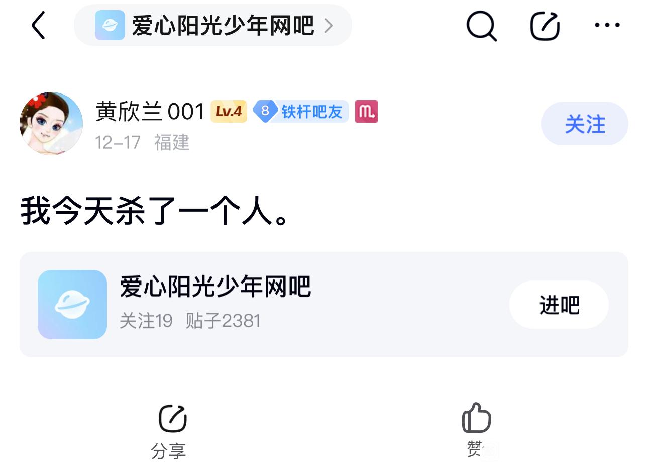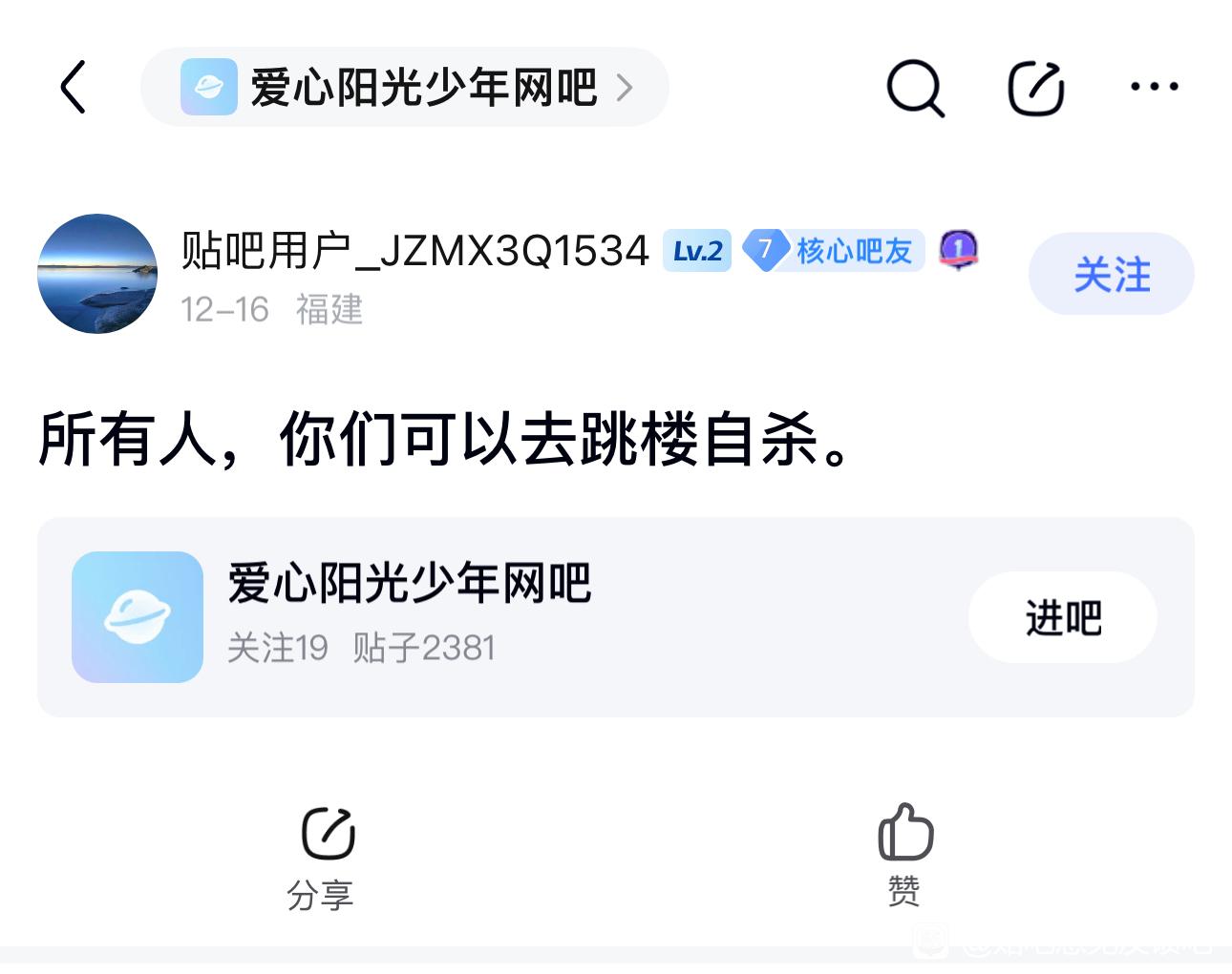 贴吧意见反馈吧 这种精神障碍,带有犯罪行为的帖子不删除封号呢?tid:103138246432025/12/19 02:25:147232 1 0楼主:东华书名最后回复:确立于统治之间不朽英豪🌺2025/12/19 18:27:391楼pid:1529950504062025/12/19 02:25:14东华书名 楼主 6级 2楼pid:1529950584712025/12/19 02:31:13东华书名 楼主 6级 4楼2条pid:1529951103442025/12/19 03:12:43Cyndi晓黄狗15级 留着还能给他们一个发泄渠道,删了后发贴人往往更想不开,更容易做出极端事情。爆风机器 MLOVEK6级 看到这句话突然有点想笑,我被封后是真确诊中度玉玉了前段时间一直失眠焦虑想紫砂,这两周吃药才调解好vvhvgdhcdd 悟往追来12级 回复 MLOVEK :看到这句话 我赶紧给我吧里封禁的那几百个人全部解封了……………5楼1条pid:1529974985052025/12/19 18:14:43行路者81815级 这种散布极端情绪化的贴吧,必须予以封杀!行路者818 层主 15级 必须惩治,以儆效尤!6楼pid:1529975415522025/12/19 18:27:40确立于统治之间俺乃大毛拉1级 这种玩意不封号,却封正常人的号