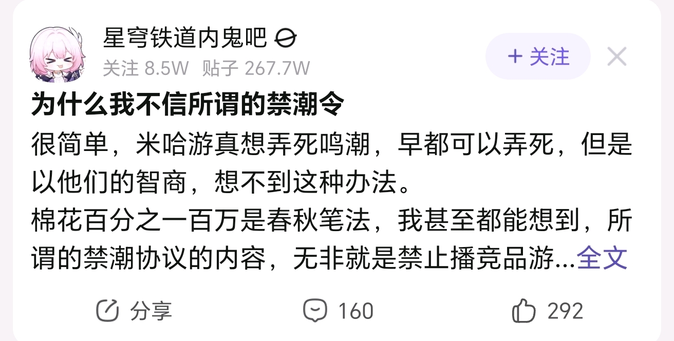 我常说,米哈游的蠢,是非常清澈的,那种憋着一肚子坏水儿的蠢,以及真的相信自己是天选之人,敢和玩家对着干的蠢。封杀鸣潮,毫无疑问是一个极端