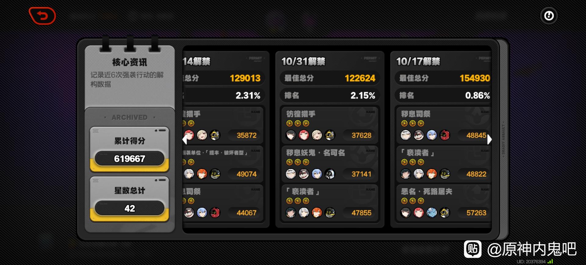 仍是4期满星,未达成5期满星。不过通过他本人发布的往期截图来看(图中6期总满星应为54,而阿哈只有42),也能得知他无法做到期期满星的事实。这也能一窥米游膨胀的恐怖,如此忠诚的玩家,都得被迫无法满星,更何况旁人?
