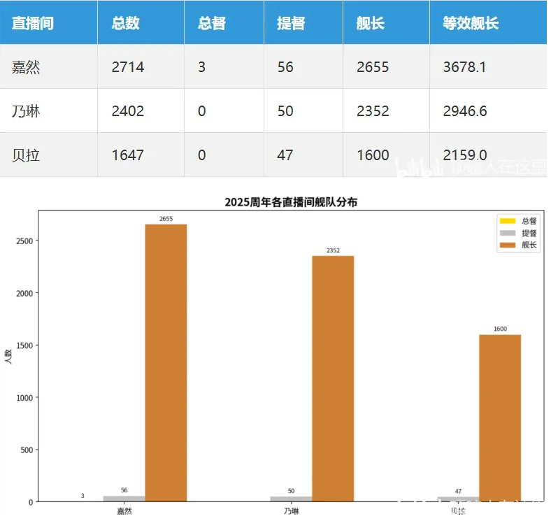 2025周年三个直播间共有6089位独立用户上舰,未去重记录数为6763,说明有674人在多个直播间重复上舰。