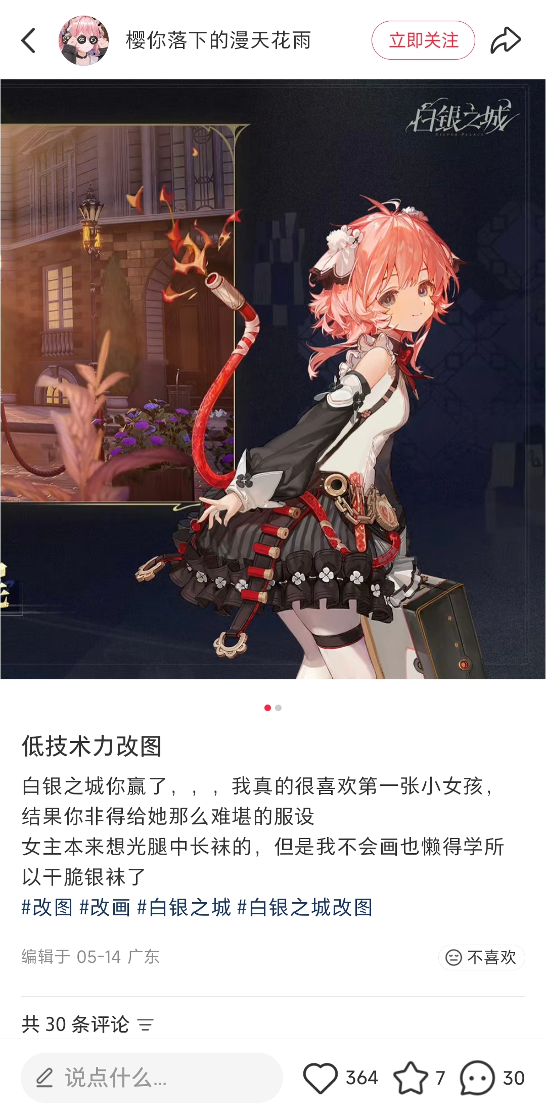 结果突然有人挖出来7个月前的小红书指责白银之城按小红书意见改角色。你的意思是说集美5月发的小红书改图把角色上半身全包了,然后连小红书官号都没有的白银之城过了7个月才“立刻”改?