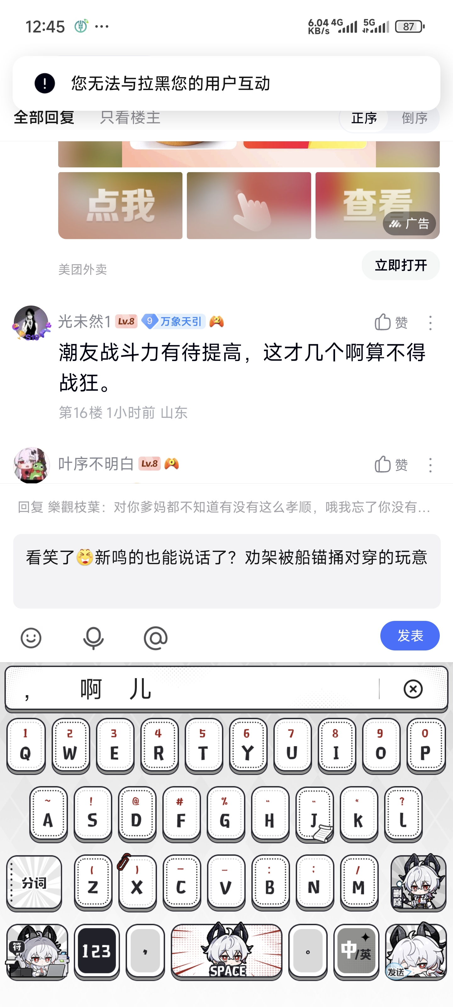 起始页原神内鬼吧 宝宝这是何意味啊tid:103214994822025/12/21 12:48:446261 2 0楼主:噢耶有timing 夜刀神十香最后回复:不列颠妖精骑士贴吧用户_aQV5tG12025/12/21 13:37:311楼pid:1530039719582025/12/21 12:48:44噢耶有timing夜刀神十香 楼主 6级 咋这么爱一击脱离呢唉唉2楼pid:1530039814342025/12/21 12:51:41黄黄歌g黄黄歌-2级 3楼1条pid:1530039851072025/12/21 12:52:50新睇特蕾西婭小吧12级 噢耶有timing 夜刀神十香 楼主 6级 4楼pid:1530039869922025/12/21 12:53:25白蝉生维里耶1级 新鸣椰果冷处理了5楼pid:1530040280722025/12/21 13:06:21说0你是猪哈哈奶龙国教大教皇13级 这位新鸣椰果太忙了,没有武德,下次找我7楼pid:1530041254902025/12/21 13:37:31不列颠妖精骑士神寂启示鸣神11级 新鸣也够冷处理了