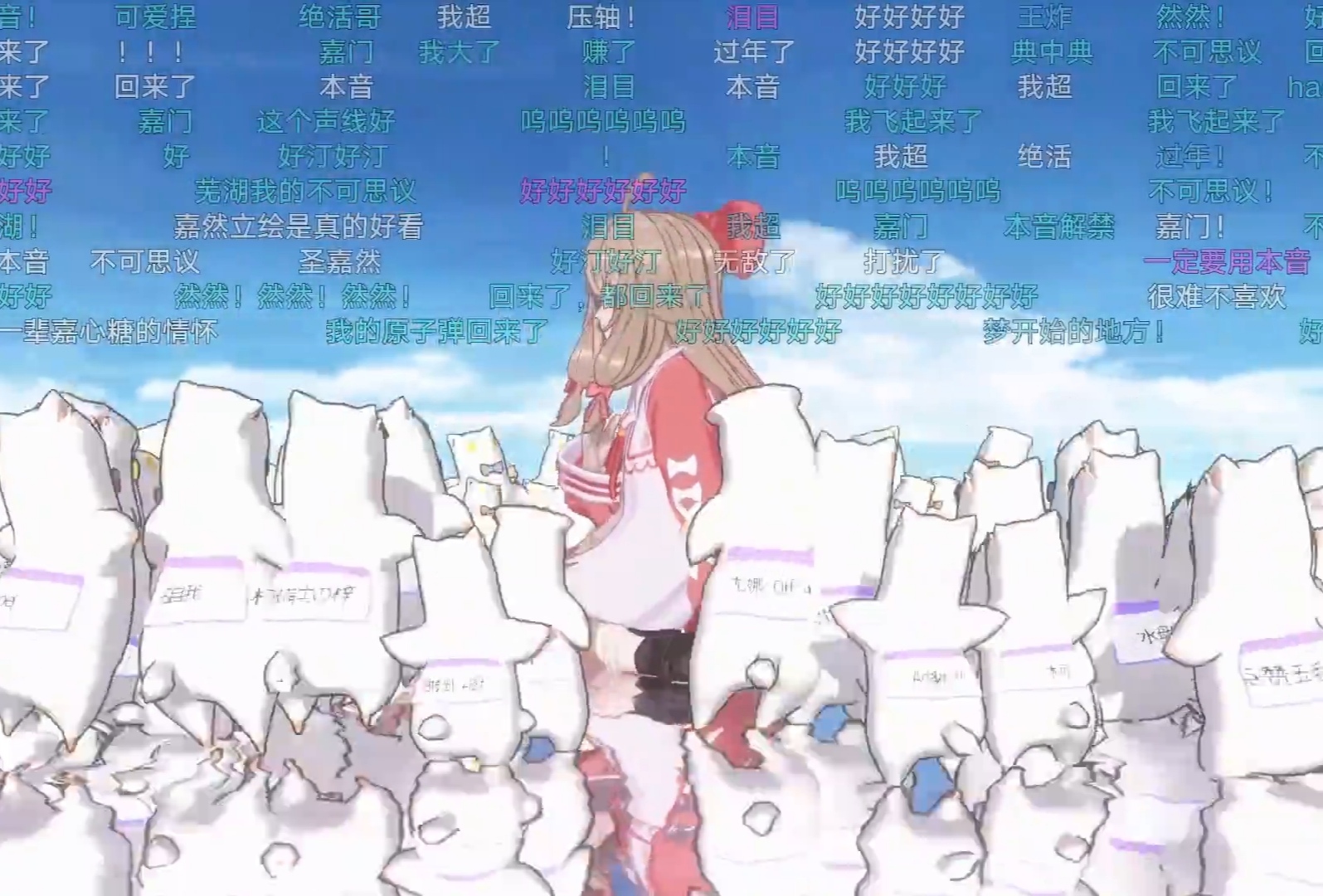 很喜欢然然那场50万直播,在朋友们都散去后,只有然然站在天水相印的空间里,看着我们,仿佛在对我们说“嘉心糖,现在只有我和你们啦”,最后在水面上坐下,嘉心糖们化为小驼往嘉然身边聚拢,大家一起听然然唱不可思议