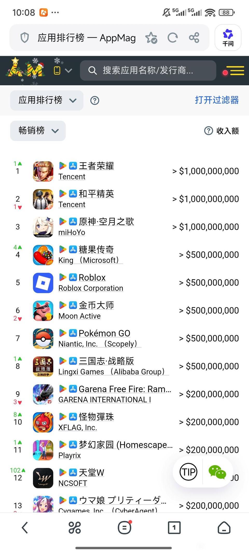 年年有余956回复:最简单的比法鸣潮现在在这个榜上是不到2亿美元而原神是大于10亿美元,等于说巅峰原神纯移动端就至少是鸣潮的5倍还多,而鸣潮腾讯说的是保底40亿那原神保底也是200亿以上的体量