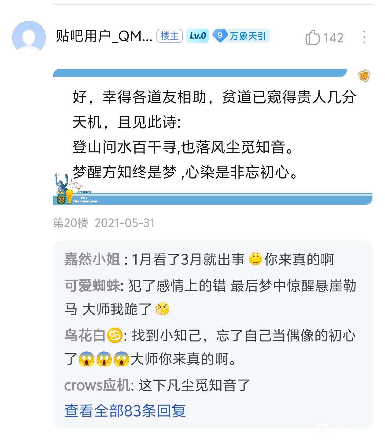 起始页asoul吧 转载 21年大师的五卦tid:103244667042025/12/22 12:40:54171460 8 0楼主:snakestaff 查布多德雷最后回复:向晚可爱捏贴吧用户_GWXVMR72025/12/22 15:06:231楼pid:1530077753812025/12/22 12:40:54snakestaff查布多德雷 楼主 9级 原帖的收藏都变成负数了🙏2楼pid:1530077779012025/12/22 12:41:38snakestaff查布多德雷 楼主 9级 第二卦3楼pid:1530077826652025/12/22 12:43:00snakestaff查布多德雷 楼主 9级 第三卦 结合最近鸣潮的事,我不好说了🙏4楼pid:1530077851602025/12/22 12:43:39轻若浮尘plus1级 还在大仙5楼pid:1530077882912025/12/22 12:44:30snakestaff查布多德雷 楼主 9级 第四卦 这个可能还没应验,估计是几年后的事了6楼1条pid:1530077941822025/12/22 12:46:17snakestaff查布多德雷 楼主 9级 第五卦 这个大家应该知道是谁学霸老亚瑟 拉胯抛瓦11级 唉偶像梦7楼1条pid:1530078018742025/12/22 12:48:30snakestaff查布多德雷 楼主 9级 唉 大师道破天机,已然离去🙏贴吧用户_JZQSJJt1级 大师还活着呢没死成8楼pid:1530078108932025/12/22 12:51:19但求天气好好有点太极端惹14级 我真服了9楼pid:1530078139722025/12/22 12:52:14幽魂君123草莓breaker11级 高僧预测:我今晚要吃面条10楼pid:1530078308662025/12/22 12:57:1712345qwertyz粉色矮子可爱捏12级 大师你可以猜猜是现在吧里哪个熟人11楼pid:1530078683562025/12/22 13:08:19bot二号机1级 高僧预测:明天太阳会升起12楼pid:1530079268632025/12/22 13:27:17云流水泽草地对天空的曲面积分11级 大师是瞳瞳吗13楼pid:1530079329652025/12/22 13:29:15为彦而歌world嶷㩸3级 14楼1条pid:1530080969502025/12/22 14:20:04向晚可爱捏向晚可爱捏~12级 日经贴能别炒了吗snakestaff 查布多德雷 楼主 9级 呵呵老东西还不滚15楼pid:1530082550742025/12/22 15:06:23mika的小雪糕小弗转职当大厨6级 我去,还真有高人啊