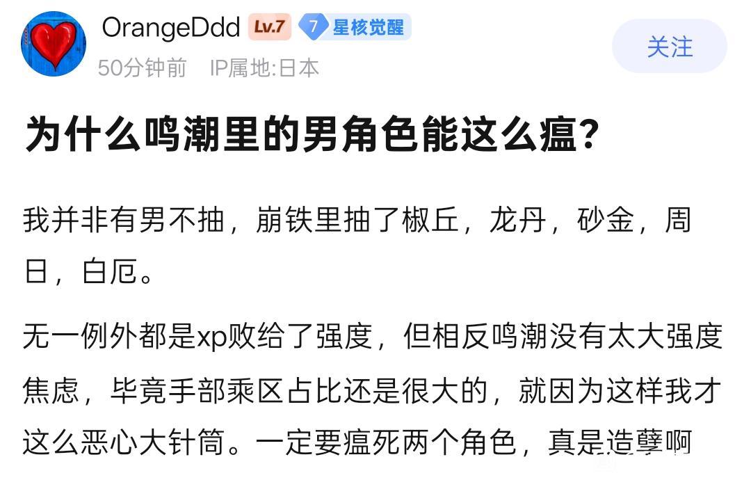 原神内鬼吧 新鸣笑话永不过时😃tid:103280806702025/12/23 14:52:526245 4 0楼主:神圣o牛马o帝国 丸山伊芙零号机最后回复:深海不是鸭 红温吃手手🍀2025/12/23 15:43:251楼pid:1530120775702025/12/23 14:52:52神圣o牛马o帝国丸山伊芙零号机 楼主 12级 我可以理解为蹦铁男角色强绑,但是角色太强了,强度战胜了XP,所以不得不抽。鸣潮男太弱了,而且游戏没有强度焦虑,手法可以弥补强度,所以鸣潮男角色就是造孽就是瘟……,额……,我无话可说,有请新鸣爆孝双方选手友情辩论2楼4条pid:1530120970352025/12/23 14:59:04aa13129三月七(不赖版)11级 为啥这个角色要叫大针管啊,技能有针管元素吗神圣o牛马o帝国 丸山伊芙零号机 楼主 12级 不知道没了解,新鸣特有的给角色起外号crazy11133 贴吧用户_5V4SGGW4级 技能还没出,好像是因为这个角色是医生,联想到针管了吧今菲汐比235 我们也是玩家8级 因为是医生吧,仇远还被叫大竹笋呢,脑回路异于常人,还是以前的新鸣鬼有活,小土豆,大船锚,麻辣圣女,你一听就知道是谁,现在的都什么玩意迷途之家9908级 回复 贴吧用户_5V4SGGW :啊?3楼pid:1530122413922025/12/23 15:43:25深海不是鸭红温吃手手🍀1级 玩不玩鸣潮都要打个?太多真正的玩家了