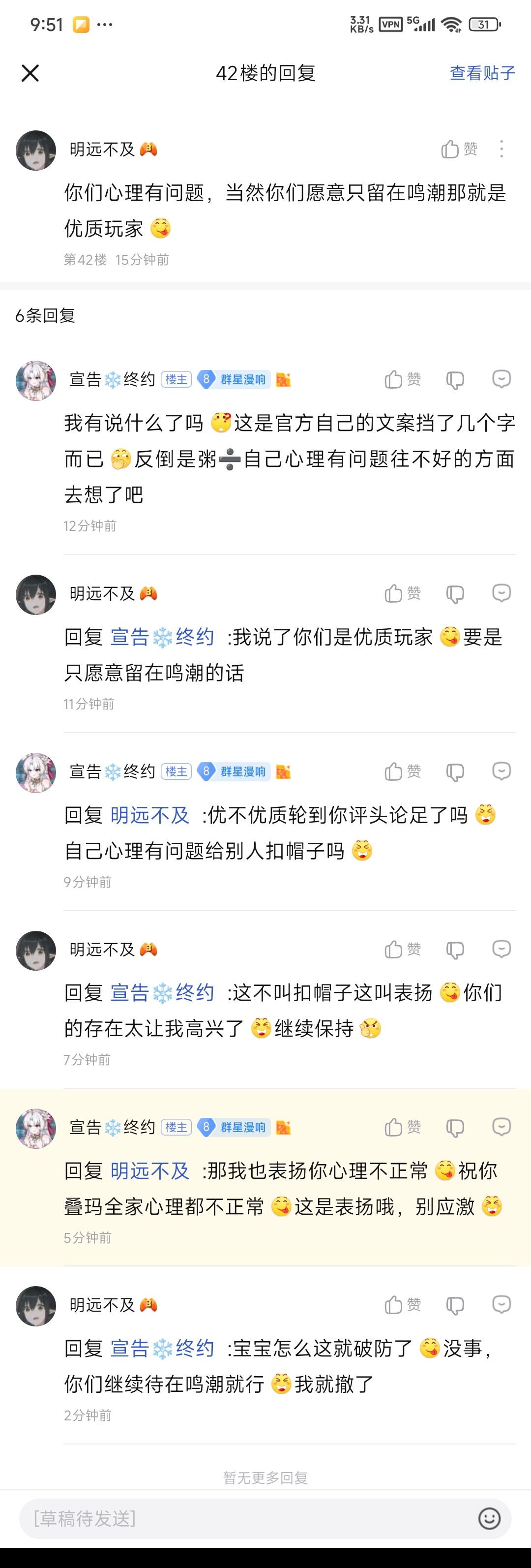 binarystring 宣告❄️终约打字累了,不再一一回复。希望你们这些动不动就代入现实攻击家人的回复让你们的内心感到痛快。