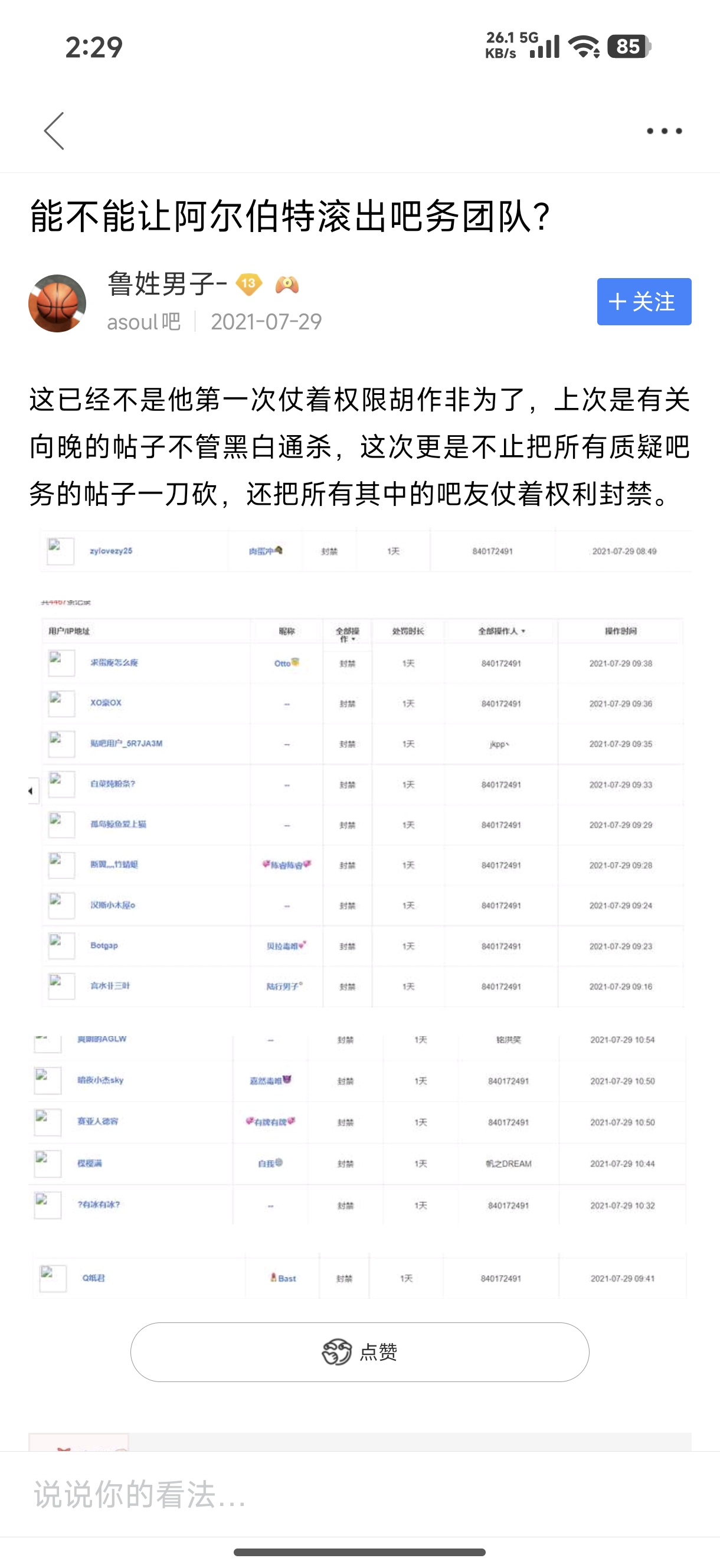 随着阿尔伯特拿回⭕️限,因为其随意杉封被下掉85的前事,担心au质疑其重拿权限,85组或者阿尔伯特选择了关闭透明85后台,不再能查询谁执行了杉封操作。但是因为85组内部的不统一意见,a88u逐渐听到风声,怀疑阿尔伯特重拿权限,于是在盒信息大战中也对85组发起质疑,最后一并被杉封。