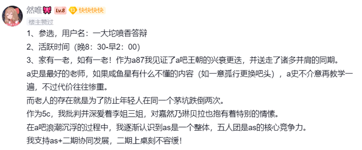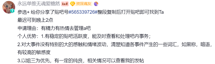 经过查阅删封记录、发言记录后,本轮小吧主竞选共有18位参选者,将采取公开投票的方式,方式如下: