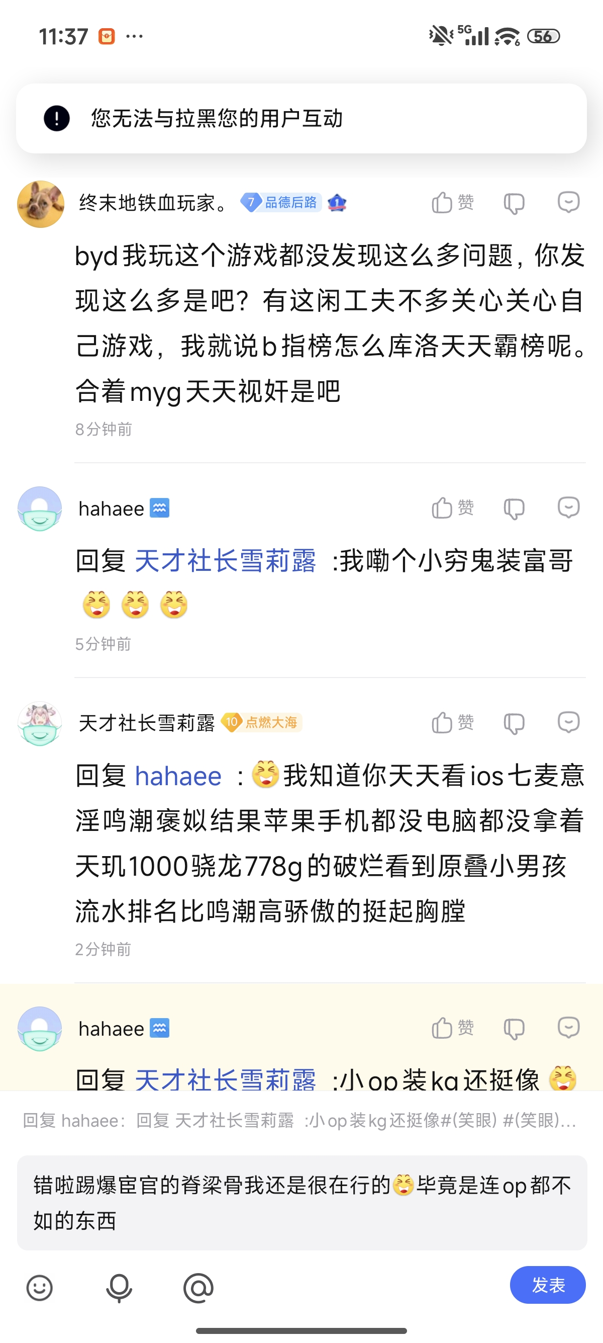 gamemodec418du 申铋喇pp回复:一击脱离是最弱智最低级的精神胜利,opkg都有这种,本来要么就事论事要么魔法对轰,骂一句拉黑然后自我高潮太低智了你拿它还没办法,对话无法继续换小号过去又有被说急眼继续精神胜利的风险,反正我是从来不拉黑人的
