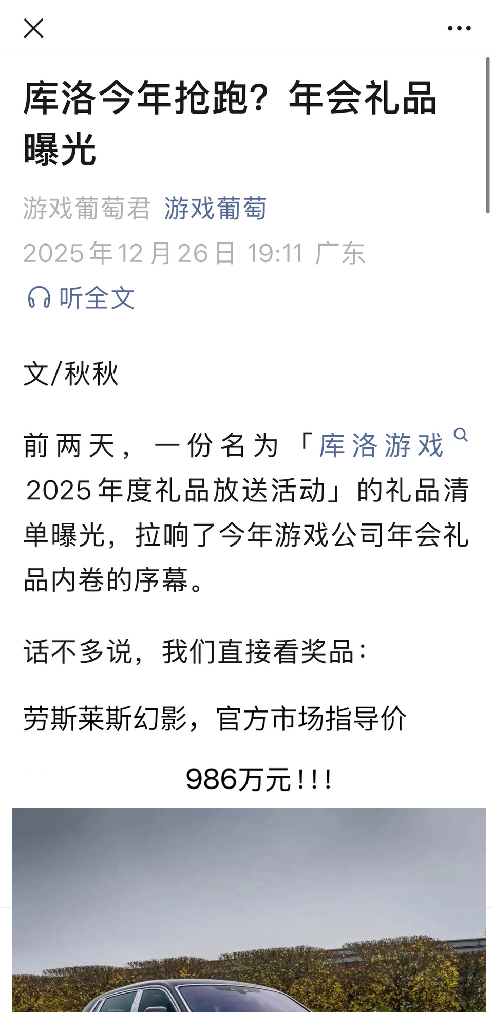 1楼pid:1530280268642025/12/27 19:25:50琳依依耶小卡今晚吃什么 楼主 11级 库洛游戏名下旗舰产品《鸣潮》获巨大成功,年利润超105亿,游戏开发部、宣发部、社区管理部共500余名员工受邀在库洛2025年会现场抽取一辆劳斯莱斯幻影豪车