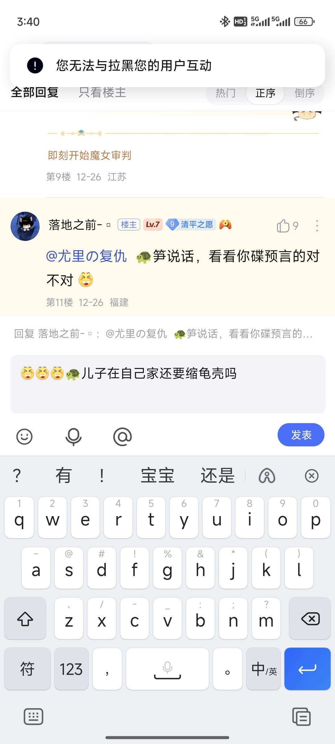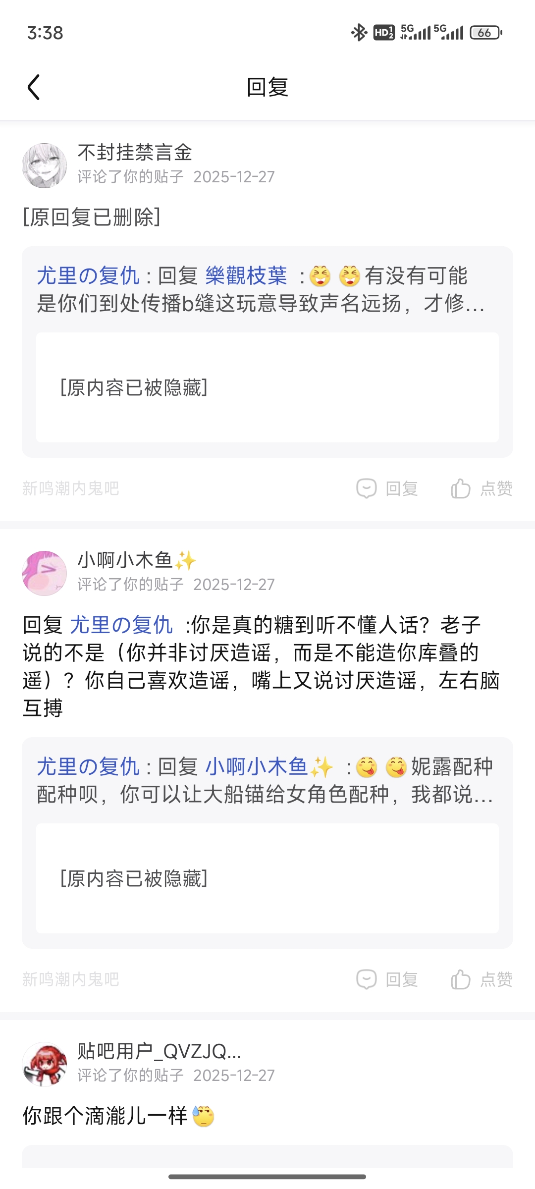 11楼4条pid:1530313507072025/12/28 17:21:50玲音相伴10级 我还想你能回答一下呢?自己帖子被删了然后被别人拉黑了然后乱@?路过0此地无银 尤里の复仇 楼主 10级 怎么了,我就是喊你过来看看罢了,免得你说我偷偷把帖子删了玲音相伴 层主 10级 回复 尤里の复仇 :没兴趣。等我说的时候你在圈路过0此地无银 尤里の复仇 楼主 10级 回复 玲音相伴 :没兴趣就不要跑我帖子下面跟别人共振玲音相伴 层主 10级 回复 尤里の复仇 :我问个问题共振说是。你这样说话实在是太酷了,一个一个圈实在太厉害了
