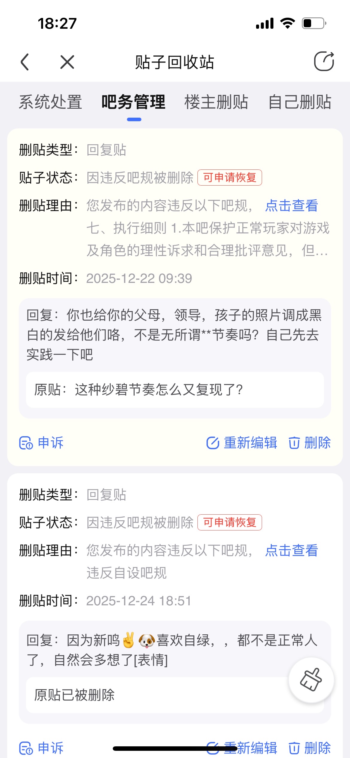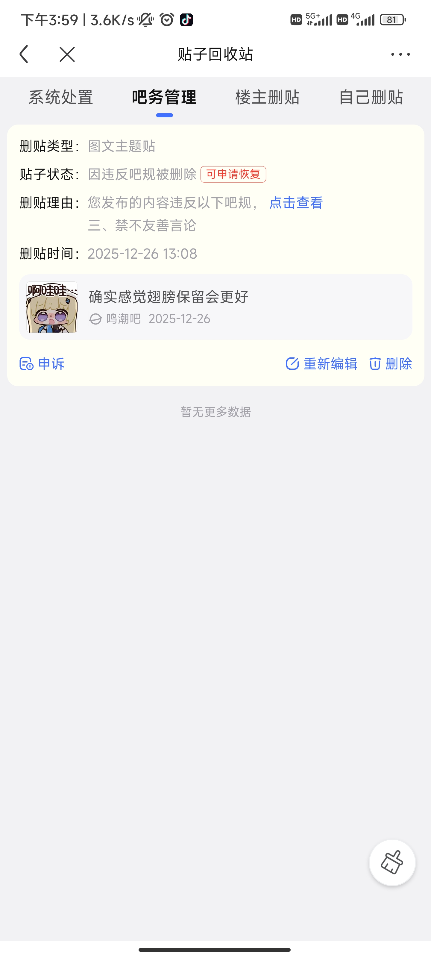 我之前也是评价一下别人的帖子就被封了,帖子也删了,声述也是理都不理你