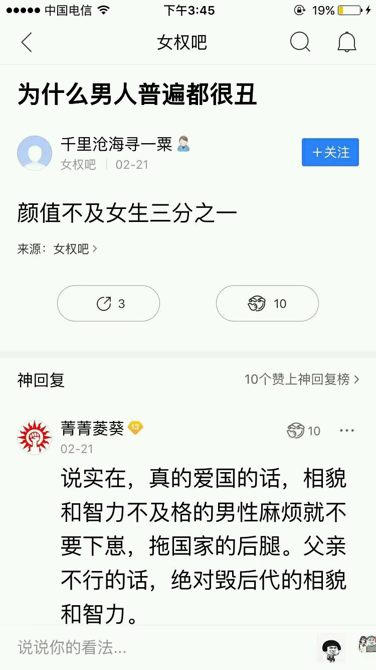 我之前本来也是女权主义者,自从去了那个吧之后,彻底倒向极端男权- 回复 哈伦哥斯酋长🐴 :但是极端女权远恶心多了,已经不忍直视了